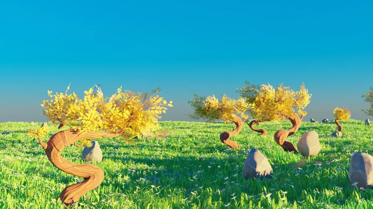 3d model of a field with trees, flowers and stones in anime/cartoon style