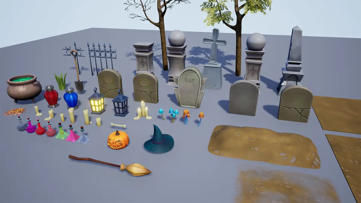 Cartoon stylized graves and cemetery assets with hand painted textures. Perfect for stylized fantasy, horror or Halloween themed games on PC, mobile or VR. The current scene is assembled in Unreal Engine 4 but feel free to reach out for file conversion.