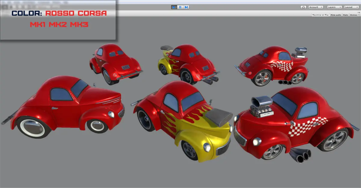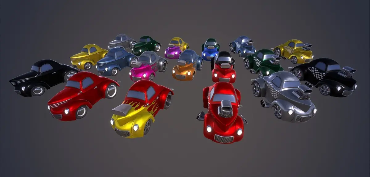 [ABOUT]This pack includes 3 different cartoon-stylized cars inspired by the car design of 1940s. Each variant differs from the others by changed or added elements. Also each model is presented in 6 varied colour scores. These models are rendered and separated for the wheel collider settings / customization.