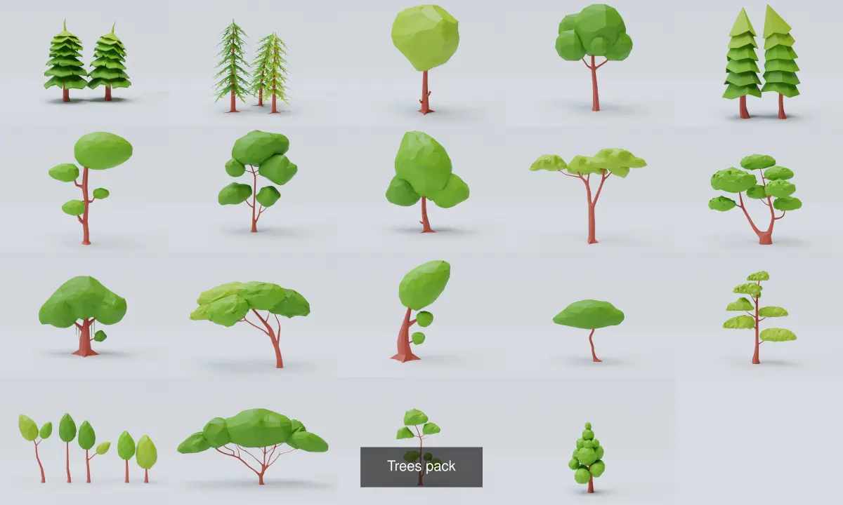 This Collection has 15 public building models, 10 shop models, 10 house models, and 19 tree models.