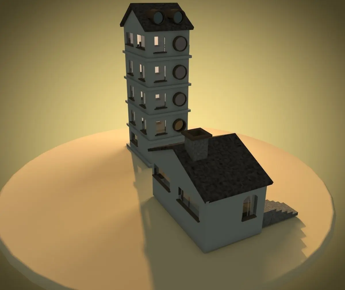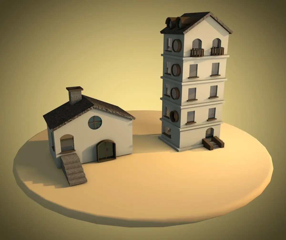 This is a combination of a small 2 story cottage and a office/ apartment building of 5 stories. the hue add a tint of warm and cozy feeling to the assets