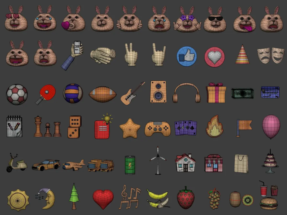 Cartoon Icons Pack - Smiley Sport Music Business IT Game Food AD Low-poly 3D model