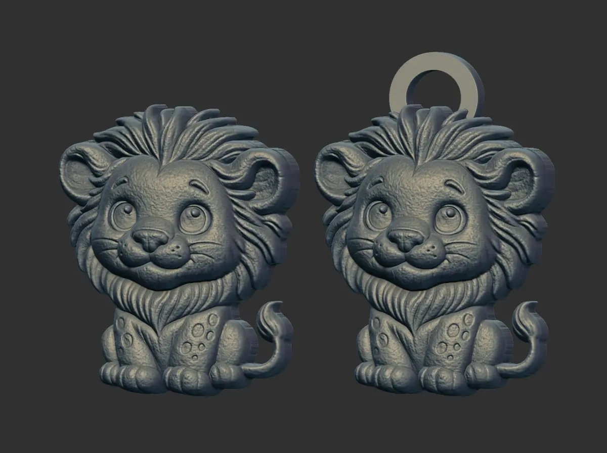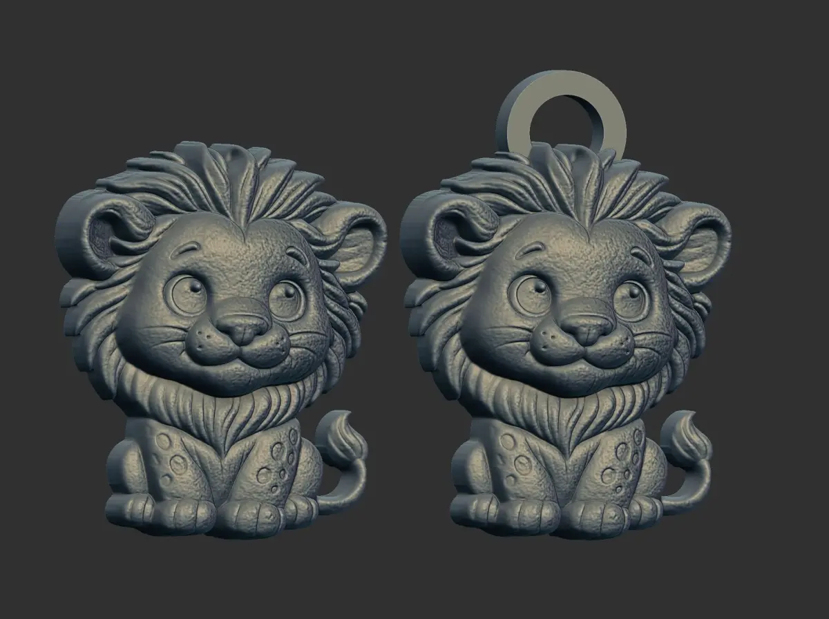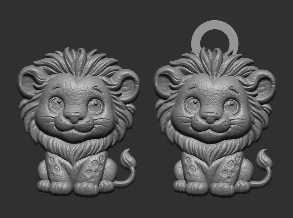 The image shows two 3D renderings of a cartoon lion, one with a ring at the top for possibly hanging as a charm or pendant. The lions are depicted in a seated position with a friendly expression, featuring large eyes, a small nose, and a smiling mouth. Their manes are stylized with textured details, and their bodies have subtle markings to suggest fur. The overall aesthetic is soft and rounded, typical of children's toys or cartoon characters. The background is a solid dark gray, which makes the light gray lions stand out.