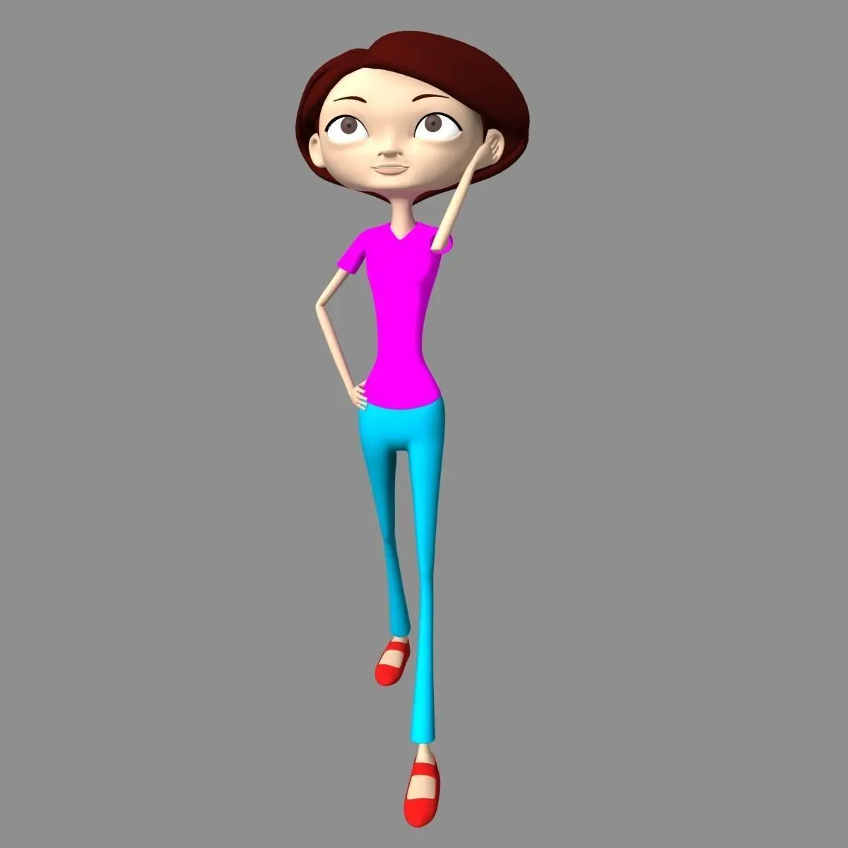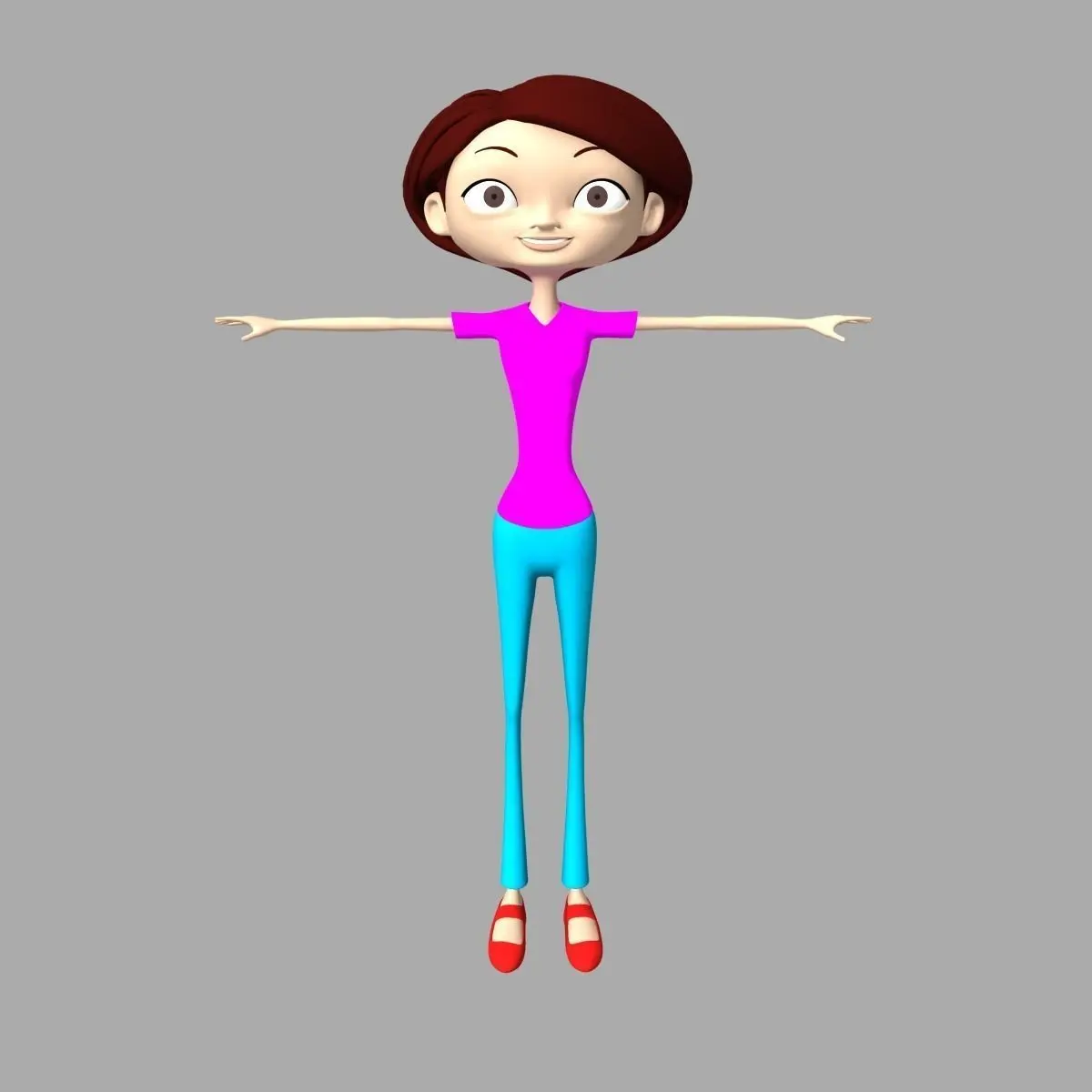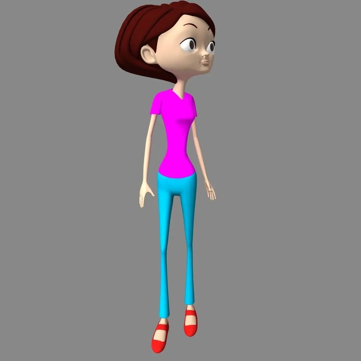 Cartoon girl, about 16 to 22 years old, with light brown skin, brown red hair and brown eyes, wearing a pink shirt, blue pants and red shoes. With the quality skeleton and a rig this girl can perform all the movements like a living character. Model fully ready to animate.