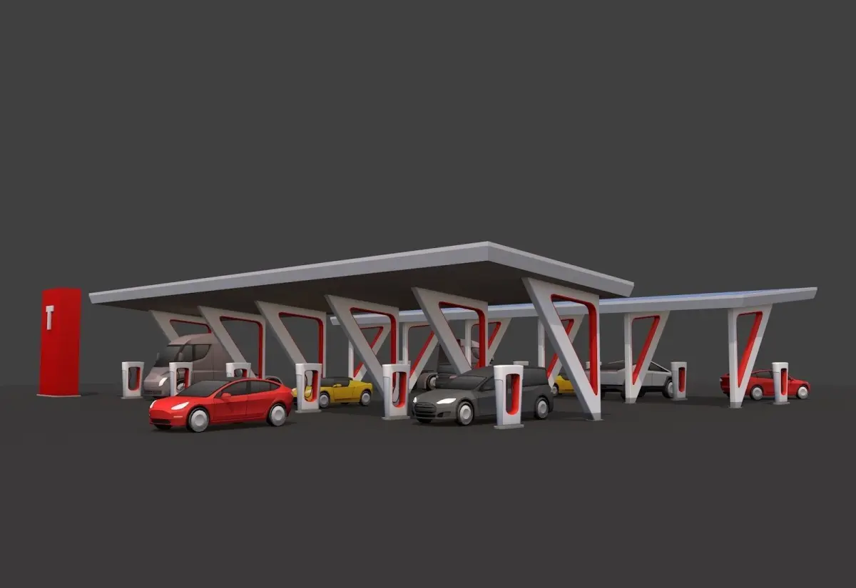 - Cartoon Styled Low Poly Esthetic Tesla Charger Station + Tesla Electro Cars Set