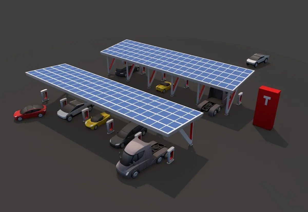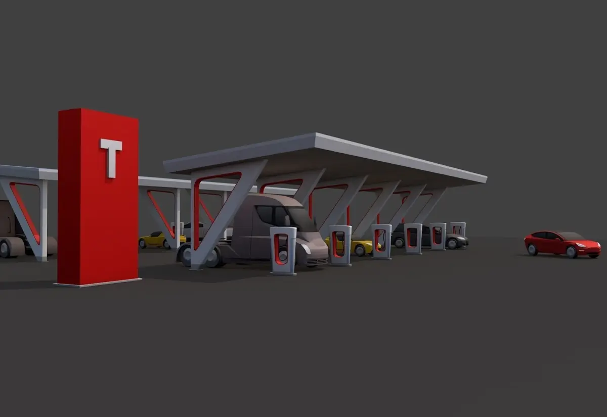 - Cartoon Styled Low Poly Esthetic Tesla Charger Station + Tesla Electro Cars Set