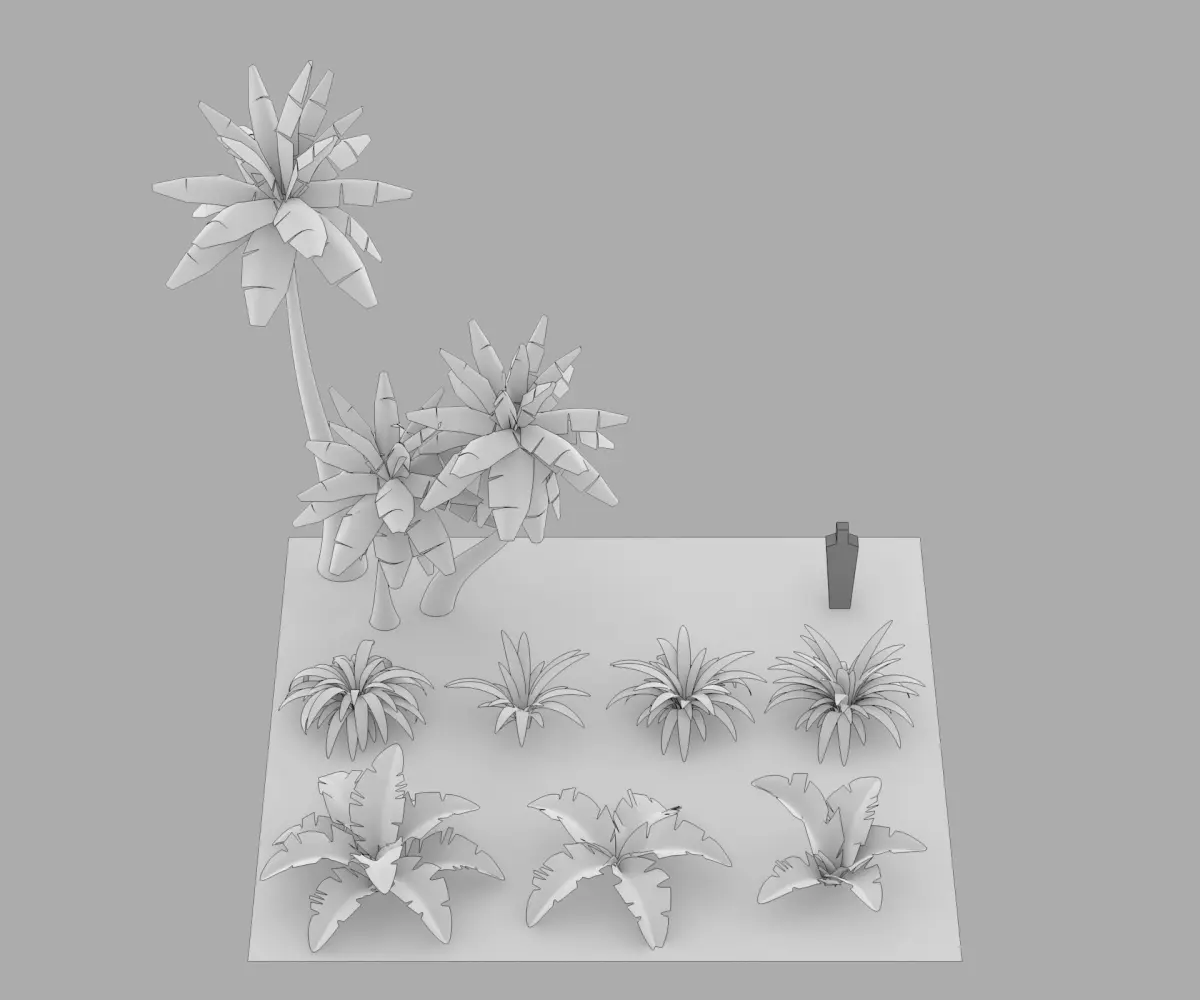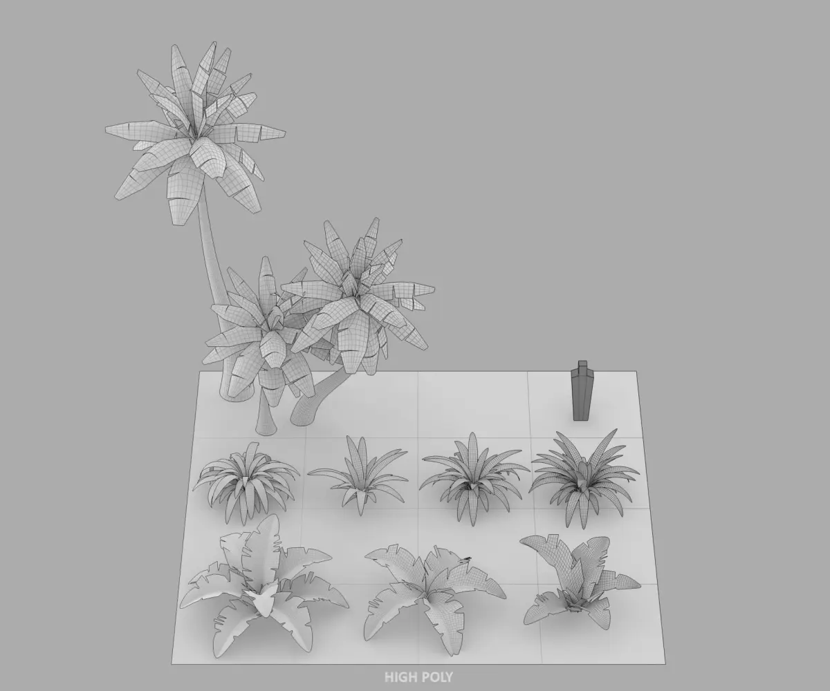 Low Ploy:Palm trees range from about 500 tris and some of them reach about 630 trisSmall plants range from about 500 tris and some of them reach about 900 tris