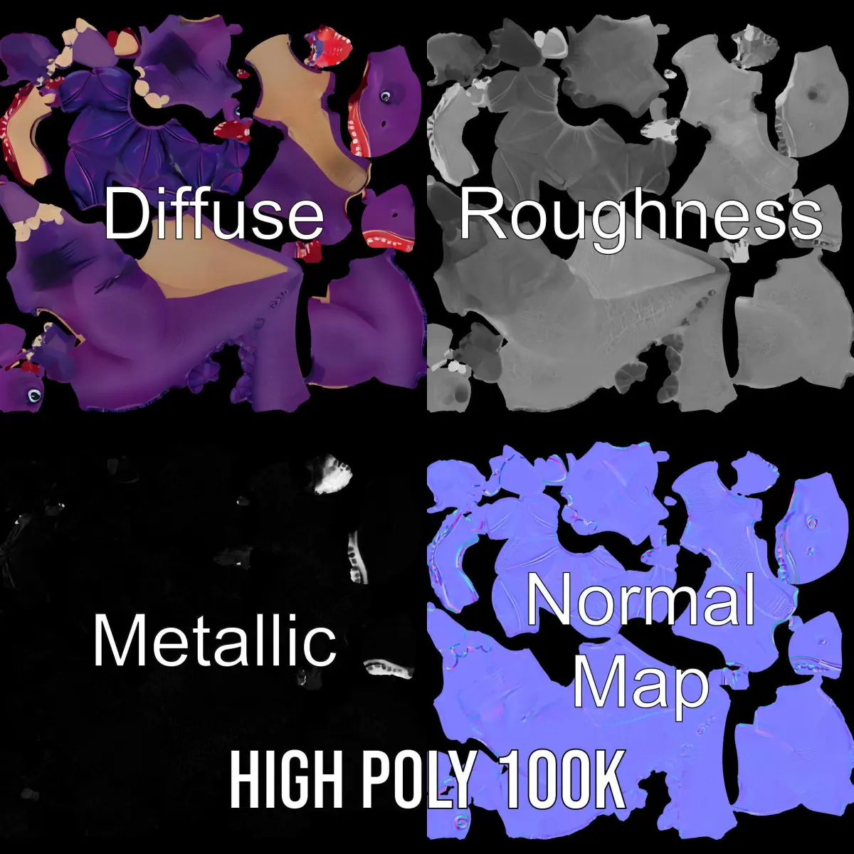This Cartoon Purple Dinosaur Model Pack features a playful dinosaur design with vibrant colors and exaggerated features. Each model has 3 levels of detail: low-poly (1000 triangles for mobile), middle-poly (10,000 triangles for environment), and high-poly (100,000 triangles), which allows for the use of this model in production rendering (such as 3ds Max, Maya, Cinema4D, Blender, Vray/Corona/Cycles and all other), game engines (Unity and Unreal compatible), and interactive presentations, providing a choice of detail based on the LOD System principle. Ideal for educational apps, kids' games, and animated films. The model's textures are PBR, Diffuse, NormalMap, and reflection/roughness/metallic, which are suitable for any modern rendering engine. All models are accurately unwrapped and have no overlapping UV. All textures are 4096*4096 in size. The first image is the reference used for creating the 3D model. It is important to carefully evaluate the quality of the model by examining the preview images that display the topology and polygonal mesh. These previews (WIRE and WEB 3D Preview) clearly demonstrate how accurately the model matches the original reference and how well the geometry has been executed. If you liked this model, please like and leave a comment!