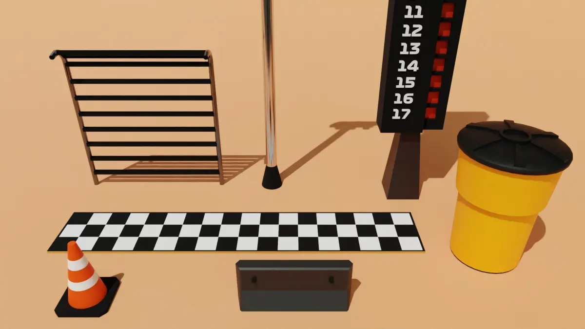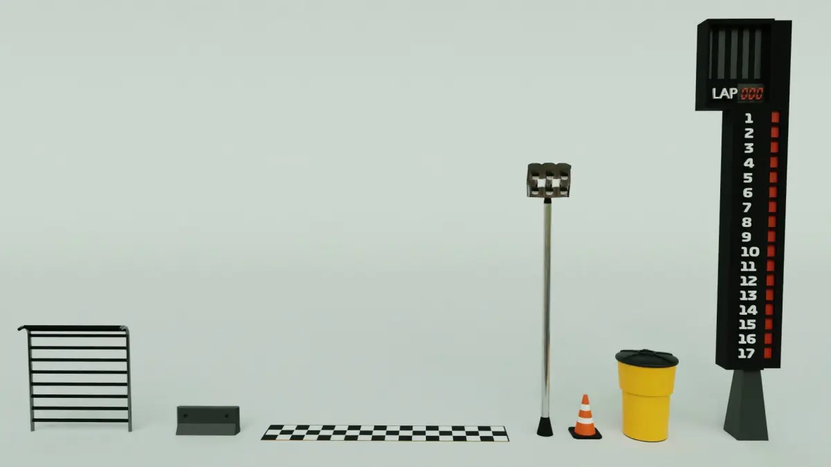This is a group of 7 cartoon low-poly models of assorted racetrack items. Consisting of a finish line, cone, impact barrell, cement block, flood lights, and racer tower, these models are perfect for adding details to your racing scenes/games. All of the materials are very simple, so they transfer very well across formats. Everything seen in the images is included. Please use these models for whatever you need.