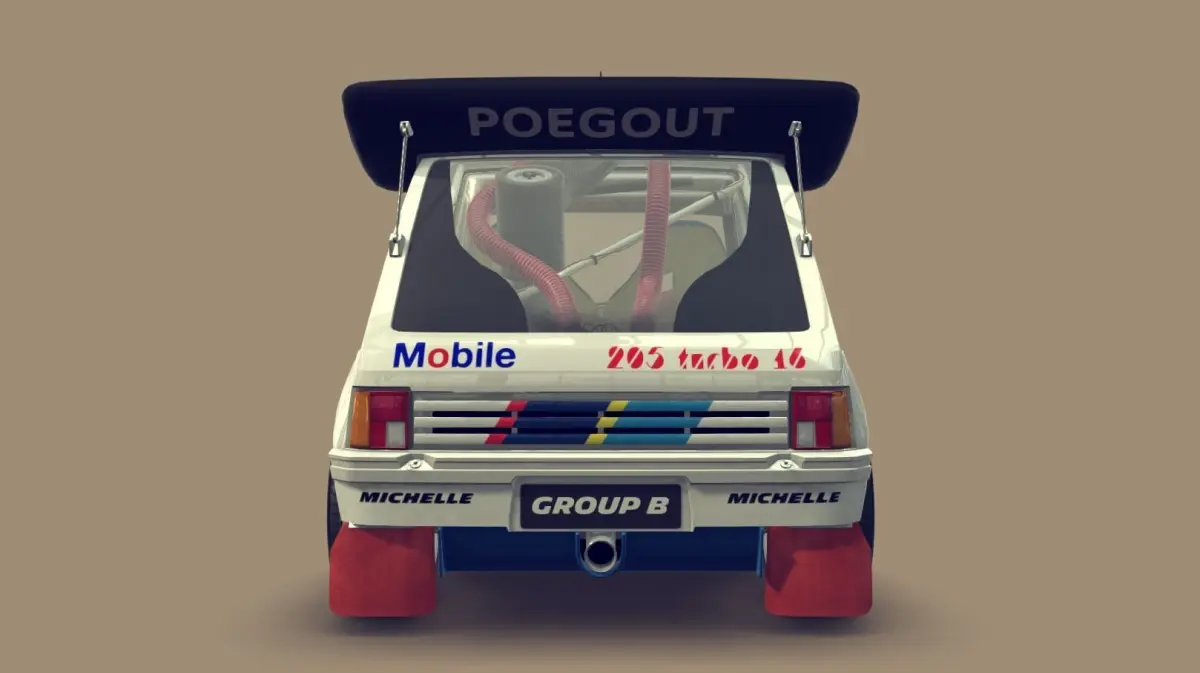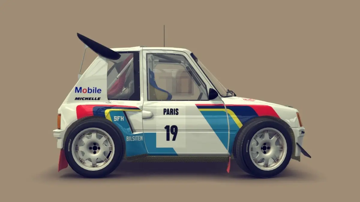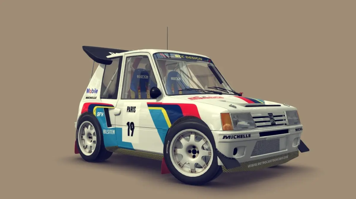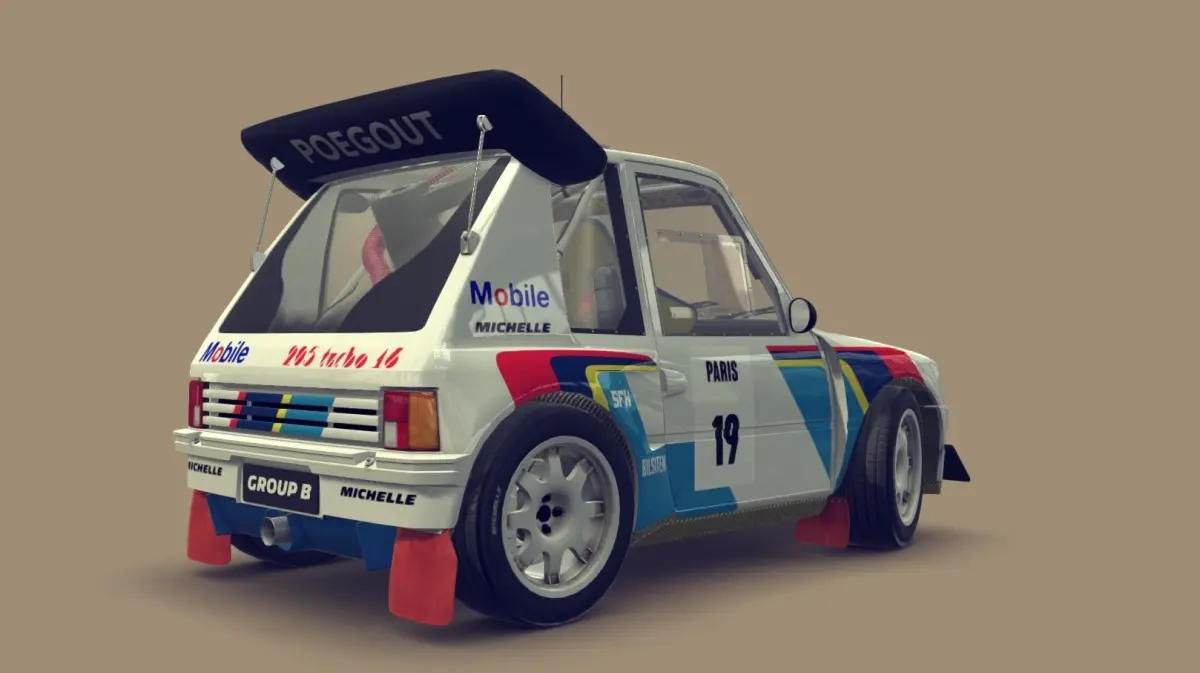 Cartoon style model of Group B rally car from 1980s. Made by French car manufacturer to compete in one of most dangerous autosport categories. Group B was introduced in 1982 and eventually banned in the end of 1986 due to fatalities.