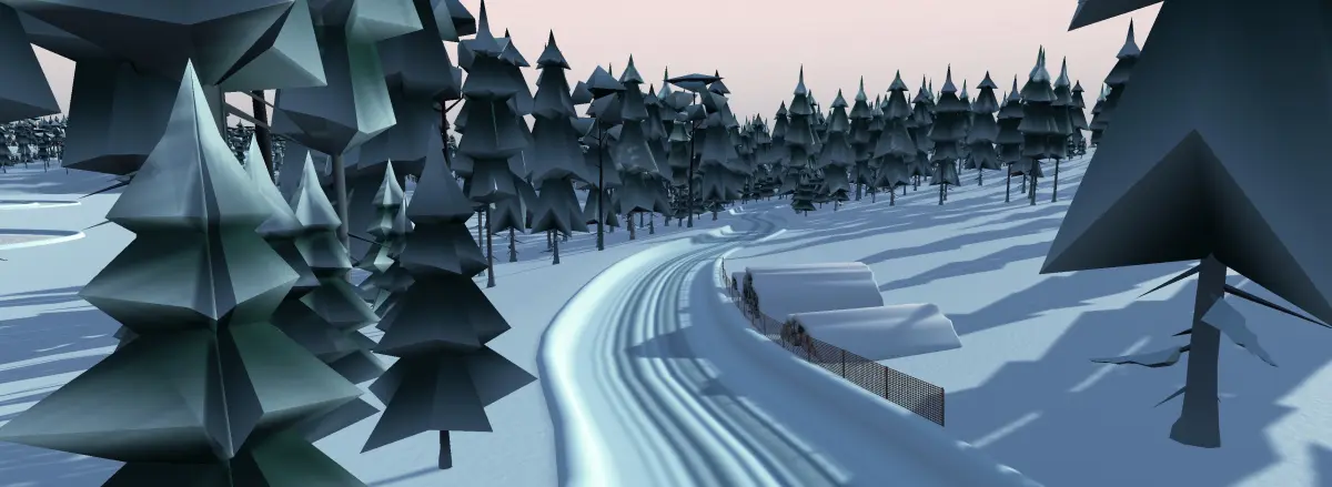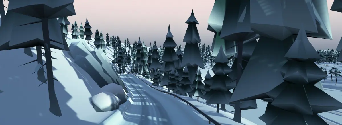 This is cartoon style fantasy rally track environment, inspired by WRC Sweden stages. You can drive between high snow banks through pine forests, and have some fun on frozen lake ice.