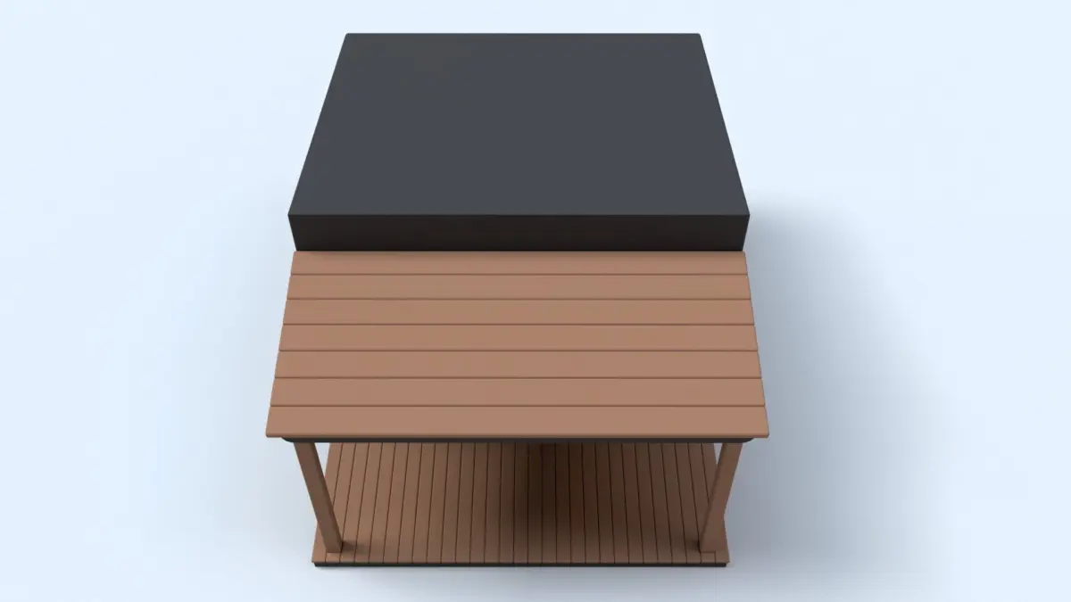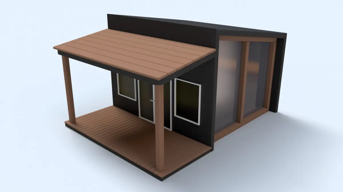 It's mainly a glass structure, with a large timber frame. A decking porch area is included, with pillars that hold up a wooden slat canopy which has been animated in a toon-like motion graphic way.