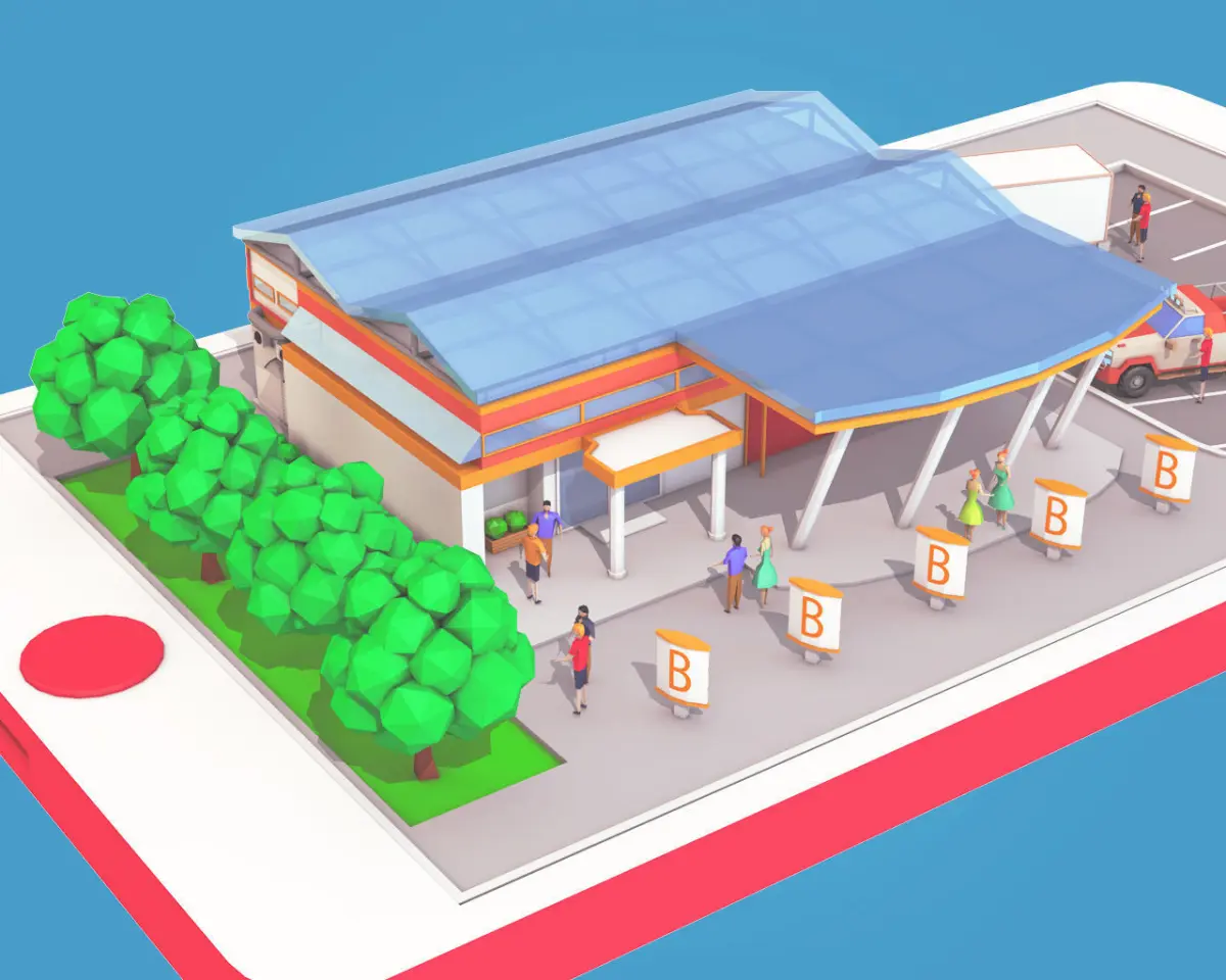 The scene consists of the Supermarket, and parking with 2 Low Poly Cars and Truck. Also there is a street elements and static people around all area. The main features of that low poly Supermarket on phone screen is a complicated scene, so this pack of models can be easy some base for your project.