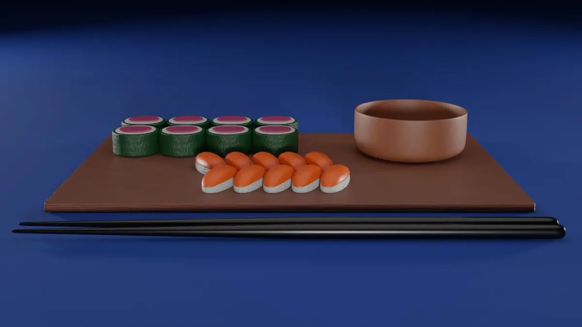 The model is a sushi set with a tray, chopsticks, rolls, a bowl for soy sauce and so on.