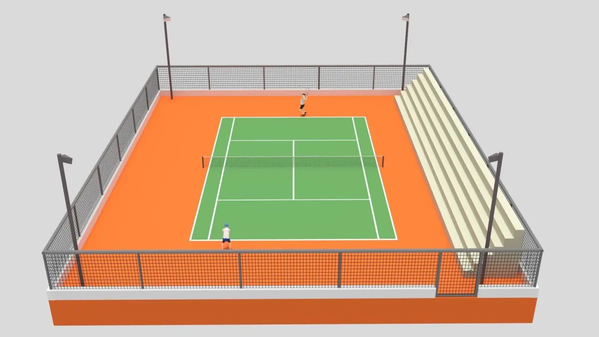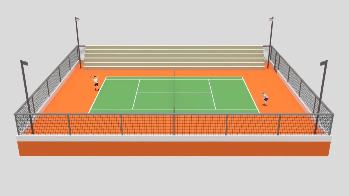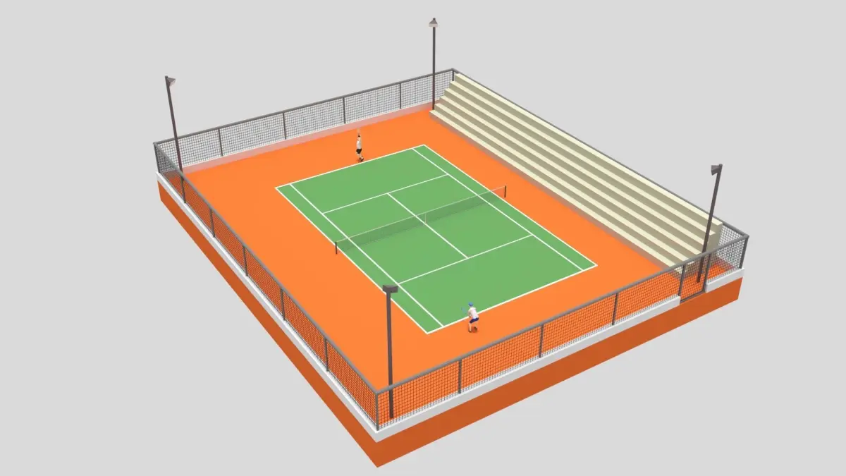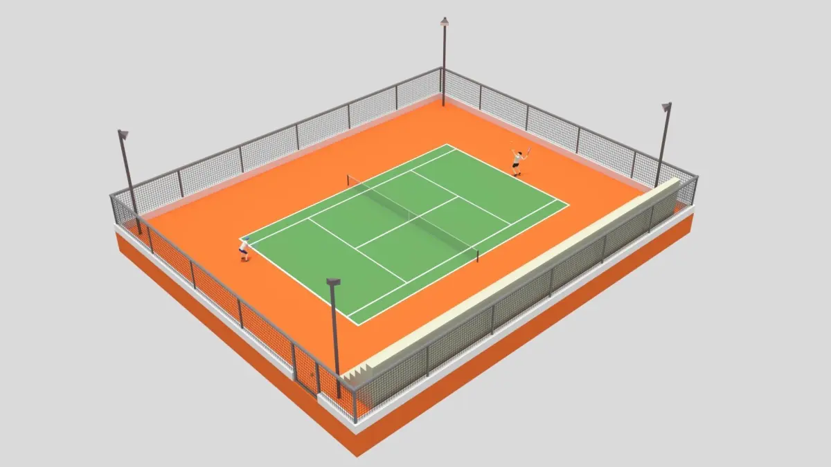This is a cartoon 3D model of a tennis court with 2 kids playing tennis. The 3D scene was modeled and prepared for low-poly cartoon style renderings, background, general CG visualization.