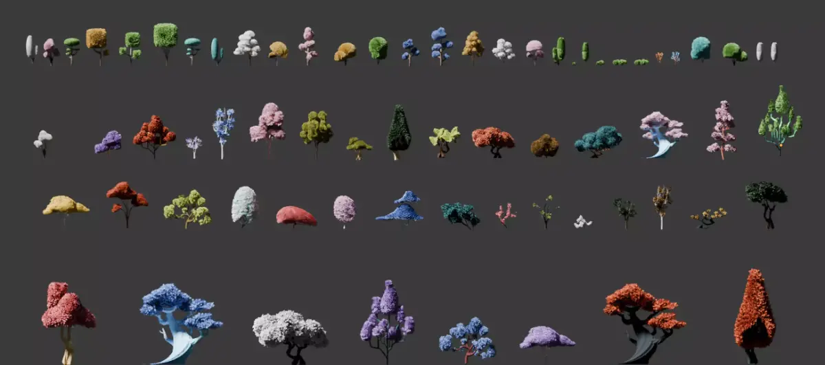 This Stylized Procedural Trees Pack includes 25+ uniquely shaped trees designed for games, animations, cinematic environments, architectural visualization, and fantasy worlds.Each tree is crafted with high-detail stylized foliage, soft shading, and clean topology, making them ideal for both close-up shots and large environment scenes.You get a wide range of tree silhouettes — rounded, cubic, elongated, clustered, fluffy, and stylized bonsai-like forms — plus multiple color variations including green, blue, white, yellow, pink, and teal.