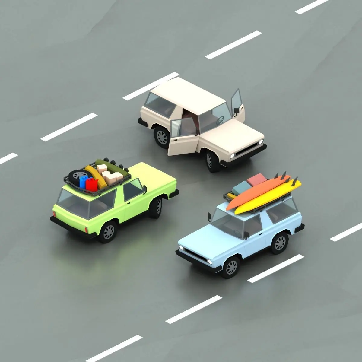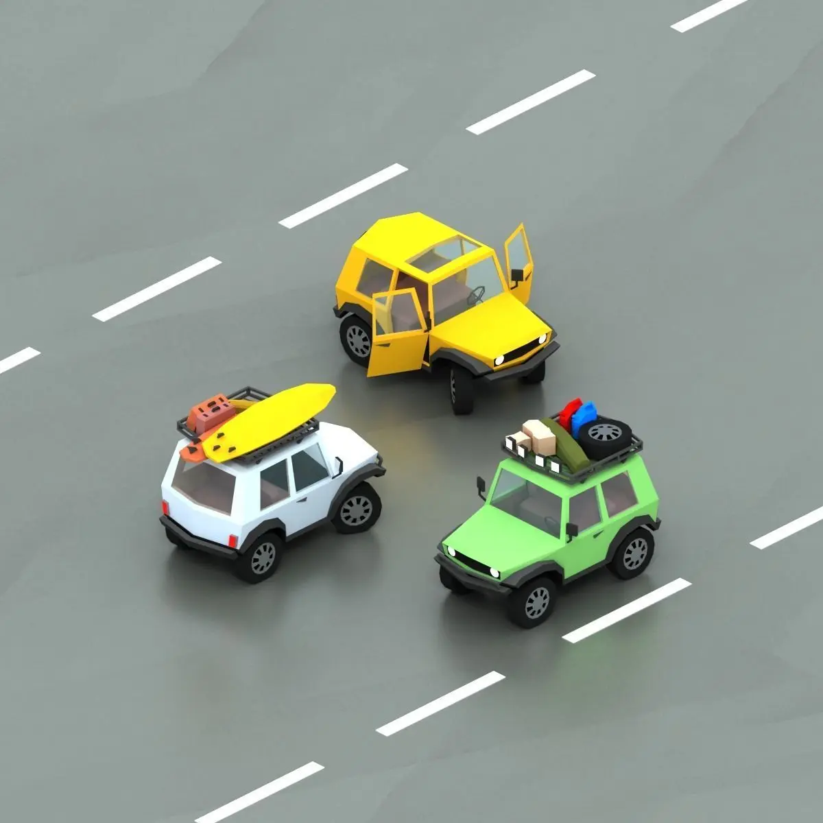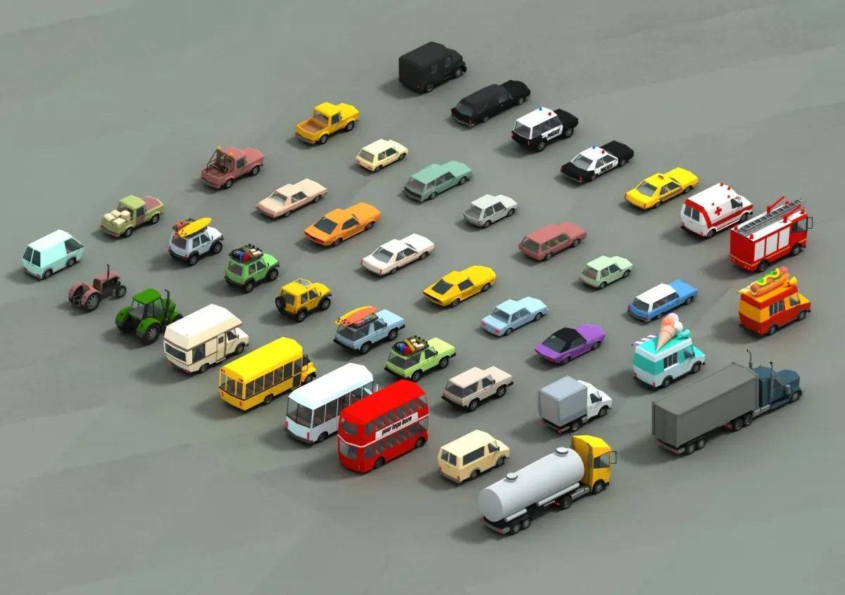 This pack contains 41 different cars. Simple interior, separate wheels, separate door. There is a separate material for the body color, so you can easily change it. All models share the same material and texture, atlas, for optimum performance on mobile devices. 1024x1024 texture maps - diffuse, roughness, metallic, emission Included formats: 3ds, OBJ and FBX