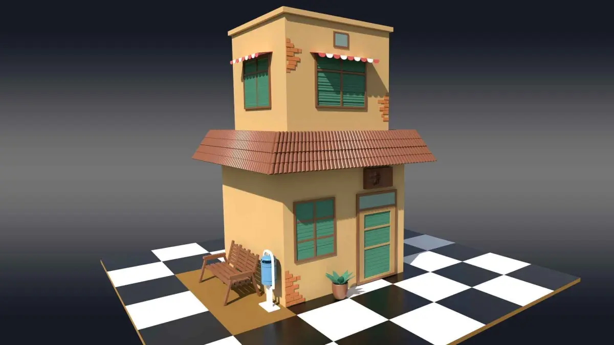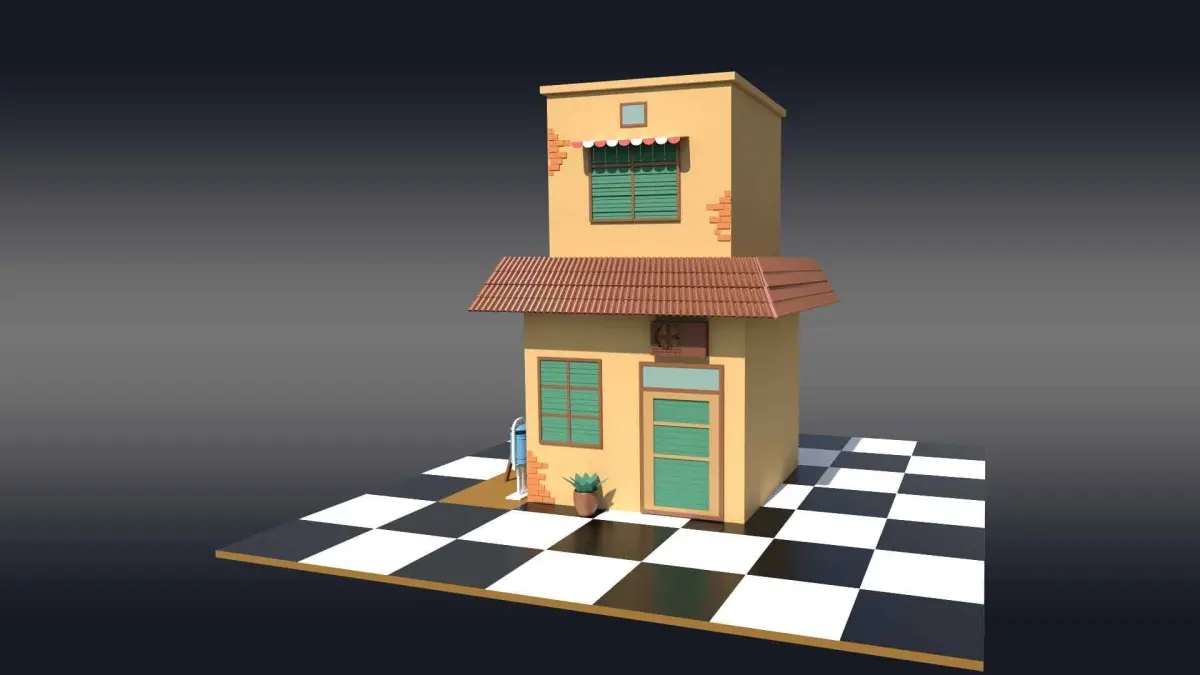 A 3D model of a house building is created using Autodesk Maya. The cartoon house is a two-story building with soft yellow-skin color walls. It has windows with green color blinds and a cheerful front door. The environment include plant pot, trash bin and a bench. This model can be used in any cartoonish enviornment, games and animations.