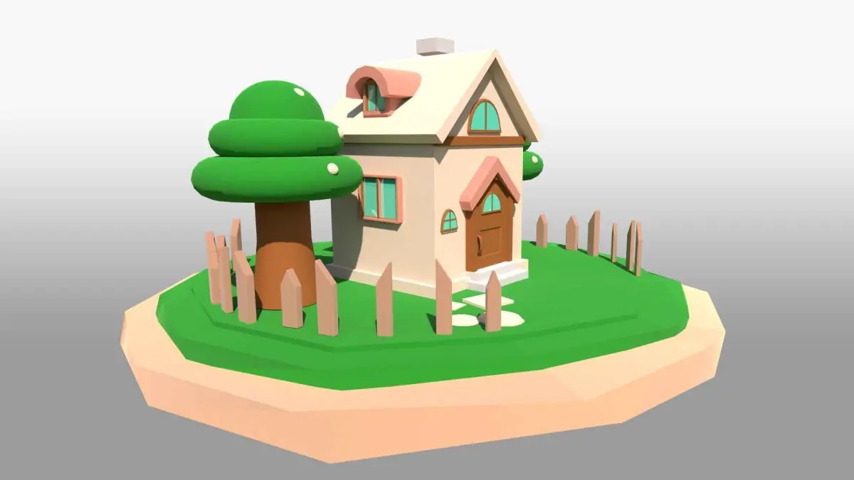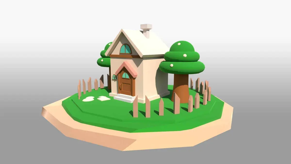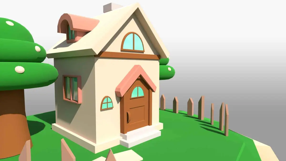 A delightful 3D model of a cartoonish low-poly house environment is created using Autodesk Maya. A cozy, stylized house with simple, geometric shape. The house features details like an asymmetrical roof, door, windows, and a himney. The surrounding environment includes a green lawn and playful trees.. Additional elements such as a stone path, a picket fence. The overall design emphasizes a clean, minimalistic style with a cheerful atmosphere, perfect for animations, games, or storytelling projects.