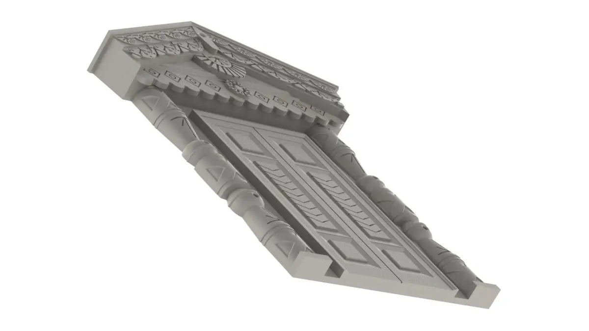 Overlay carved door with roof. Patterns and columns can be made either on a wood or plastic router or printed on a 3D printer. STL files for the entire structure and individual parts are attached. The upper part is available in two versions, with different patterns.