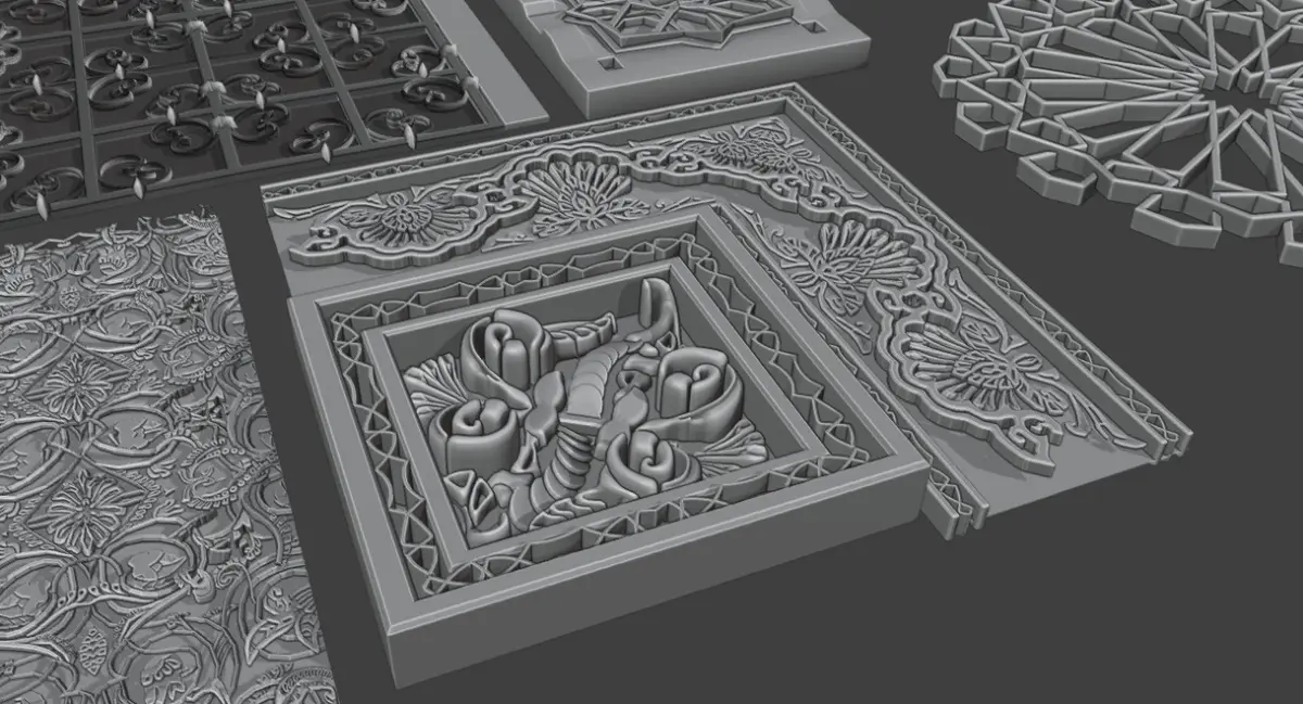 A decorative wall featuring arches in the Oriental style, designed specifically for an Eastern or Moroccan mosque. The wall showcases intricate Arabic stucco patterns and ornate Islamic motifs, with luxurious Eastern cornices and detailed plasterwork, adding a touch of elegance to the space.