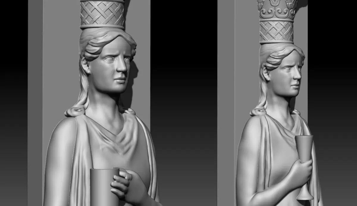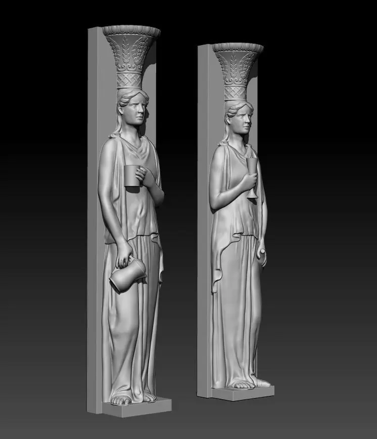The sculptures represent two caryatids with capitals, specular, but not the same.Both were sculpted in Zbrush and checked with Meshmixer and 3DBuilder.The statues are on two separate files in STL, OBJ and ZTL format; about 630K /670K vertices.