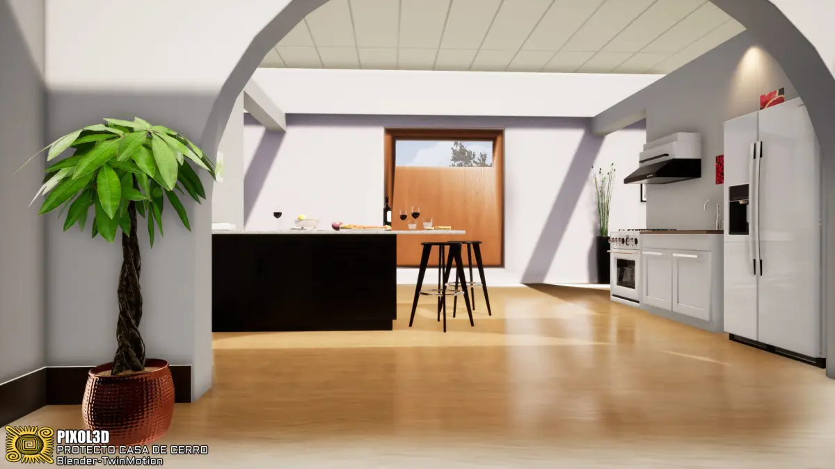 Casa del Cerro project, where the wide interior spaces, glass section, covered swimming pool area, gardens and parking, all built with curved end walls, stand out.Made in Blender, Cinema 4d and Twinmotion.