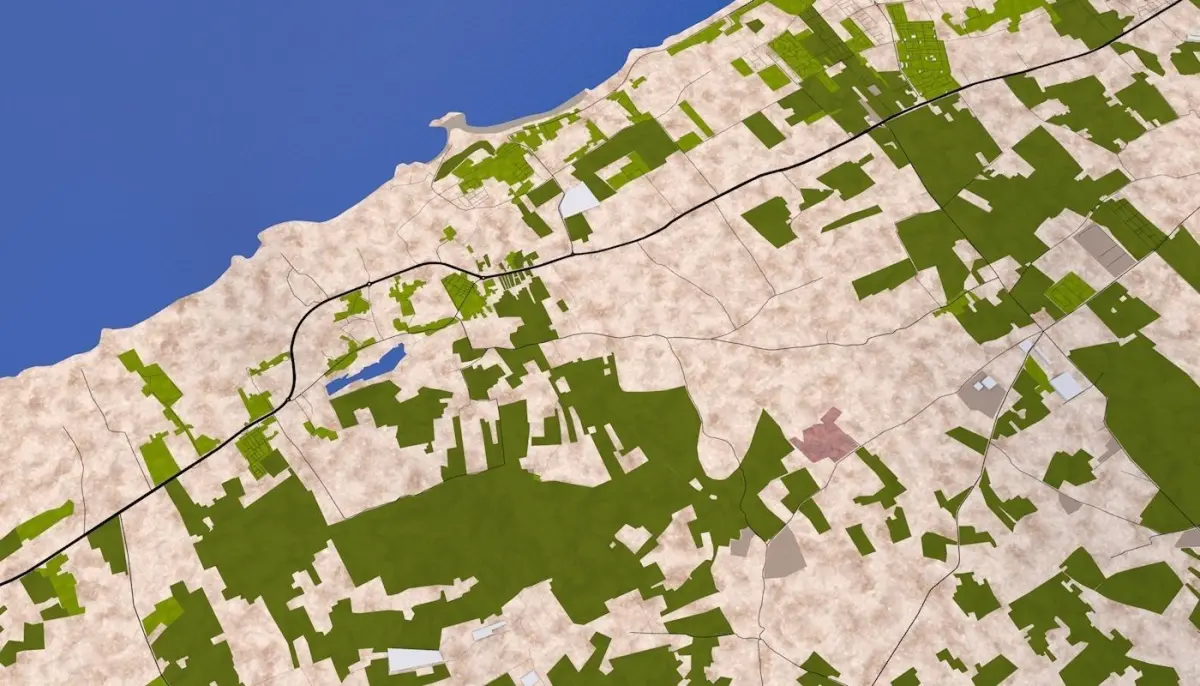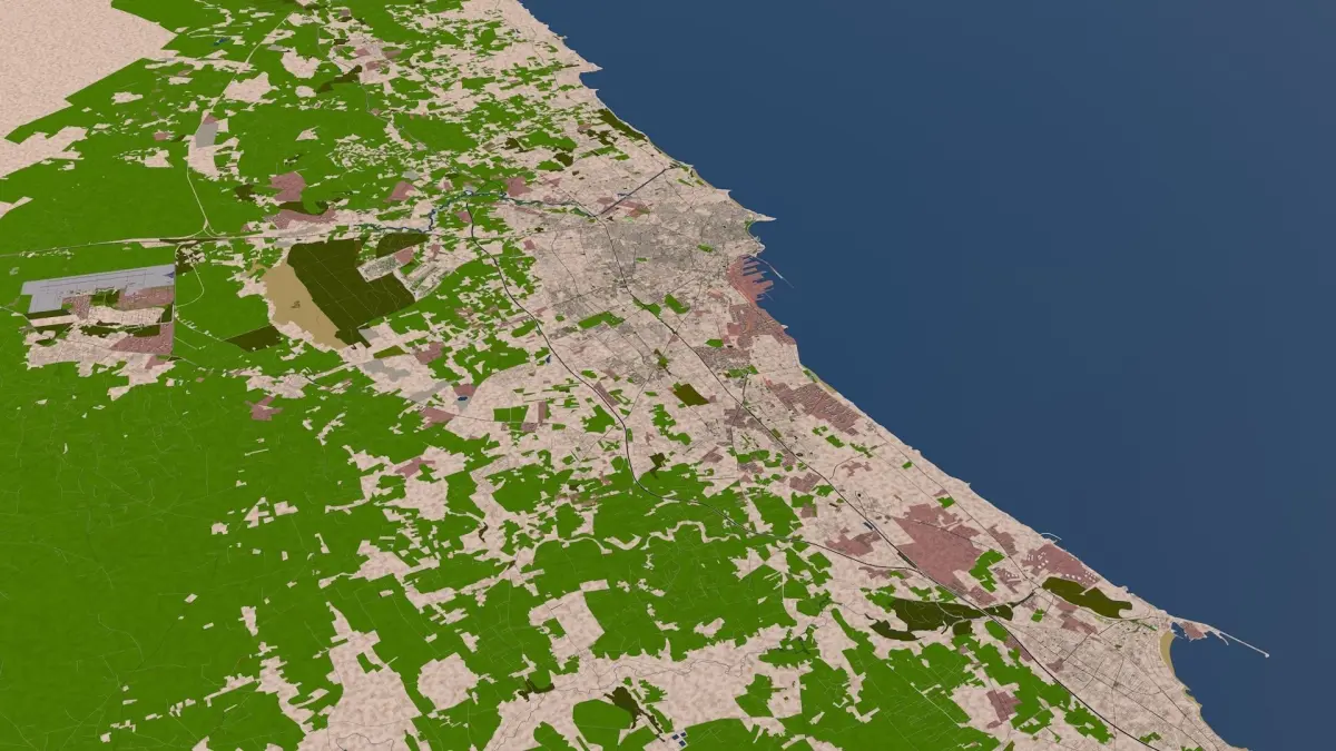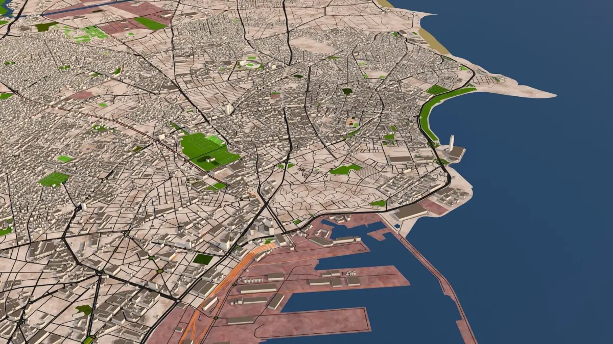 3D representation of Casablanca_Morocco using August 2020 map data. Roads, railway, land, water, buildings are made using real world data. Buildings are accurately placed and resembles the real world object up to some extend.