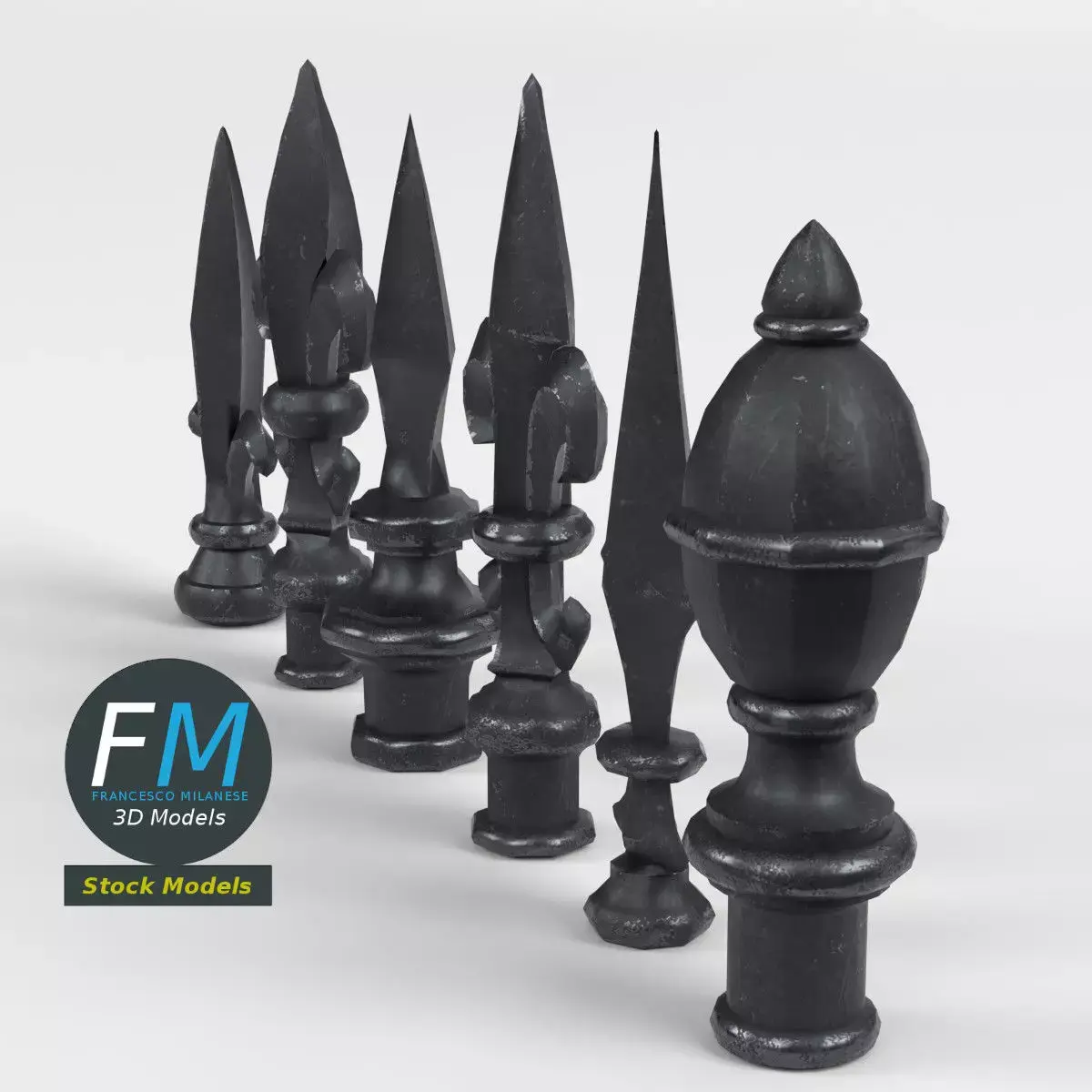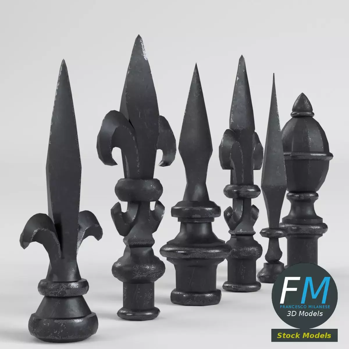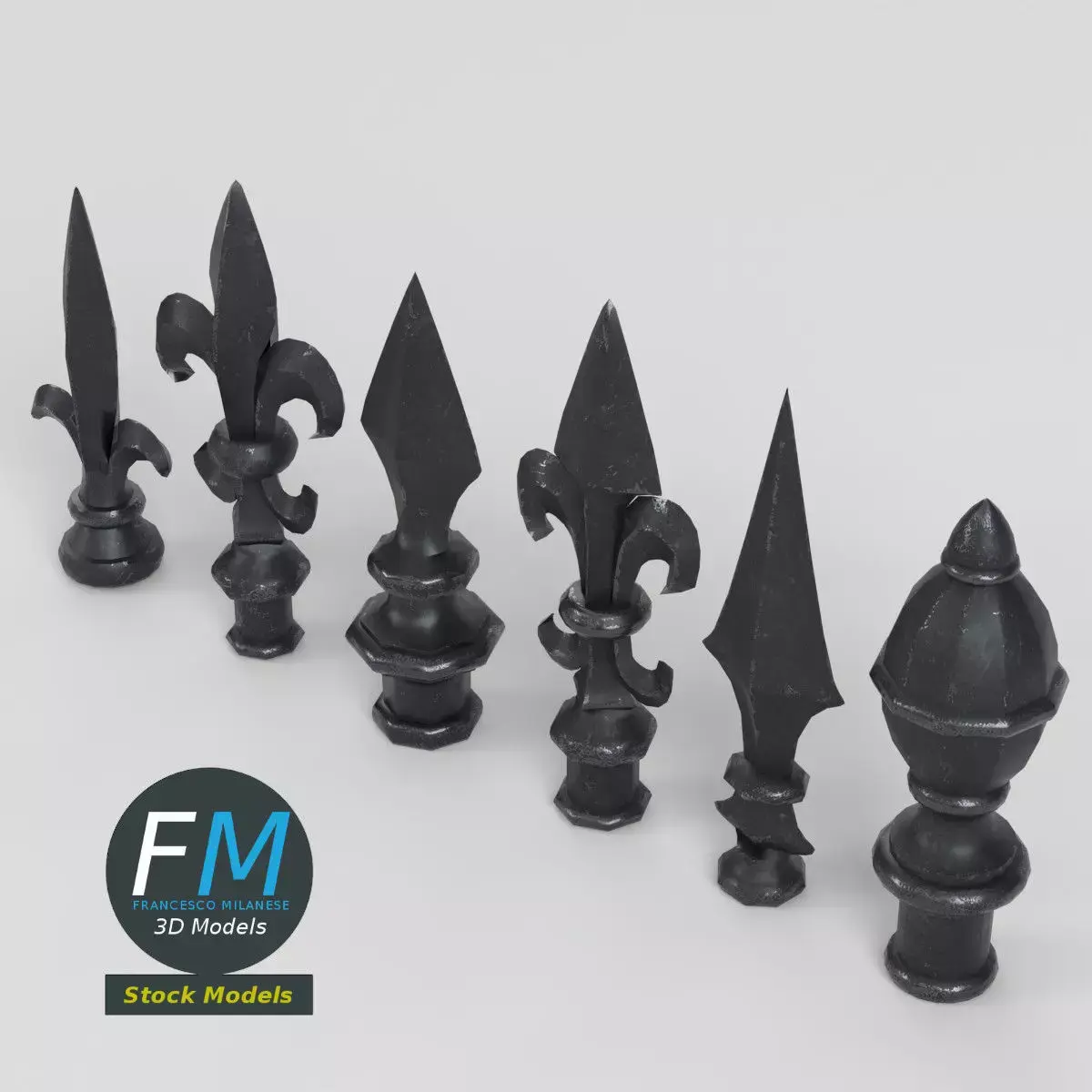 A set of cast iron fence finials (points, tips, toppers) 3D Models. 6 individual objects sharing the same non overlapping UV Layout map, Material, and PBR Textures set. Production-ready 3D Model, with PBR materials, textures, non overlapping UV Layout map provided in the package.Quads only geometries (no tris/ngons).Easily customizable: UV unwrapped geometries; UV Layout maps provided in the package as png with alpha images.Each Object, Material or Texture provided in the package has a unique, meaningful name.Made with Blender 4.5.0 LTS with Cycles Principled BSDF PBR shader with textures included (Eevee compatible), then exported to OBJ and FBX; materials and textures made with Substance Painter (Adobe 3D Painter), exported for PBR, Cycles, V-Ray, Unity, Unreal.PROMO IMAGES: the first image has been rendered in Cycles for Blender; in particular, you can find 11+ promo images in this description: