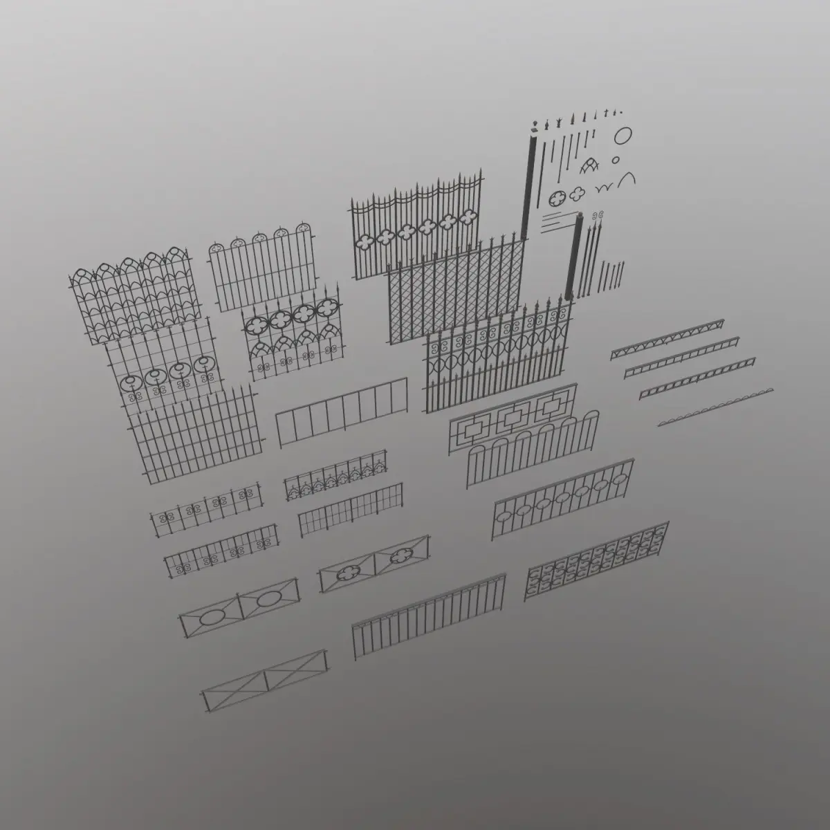 25 Metal Fence assets - 9 Metal Fence poles - 30 Parts for building new Fence assets