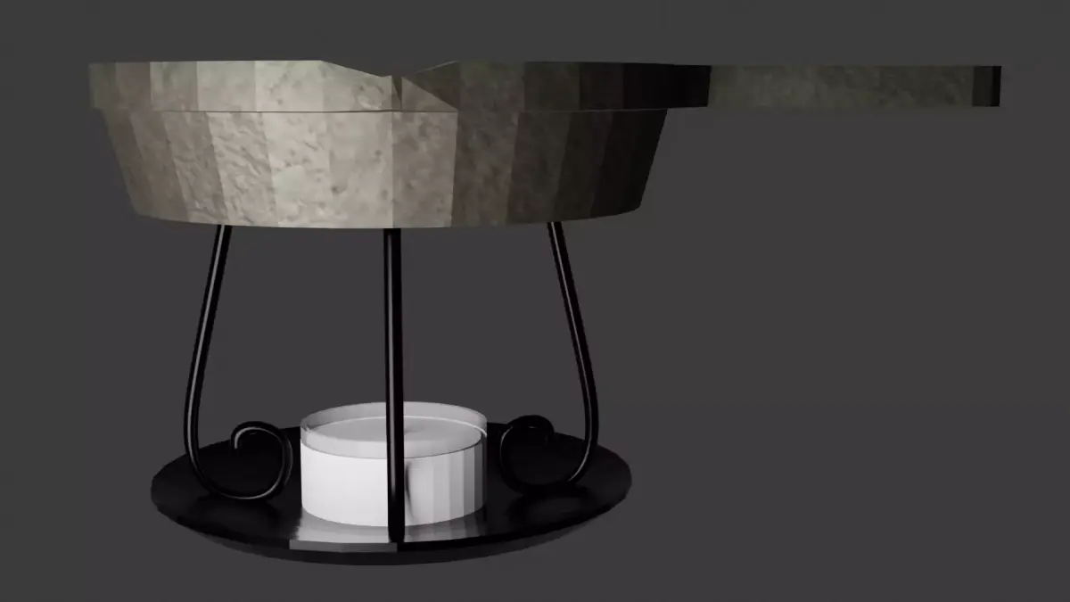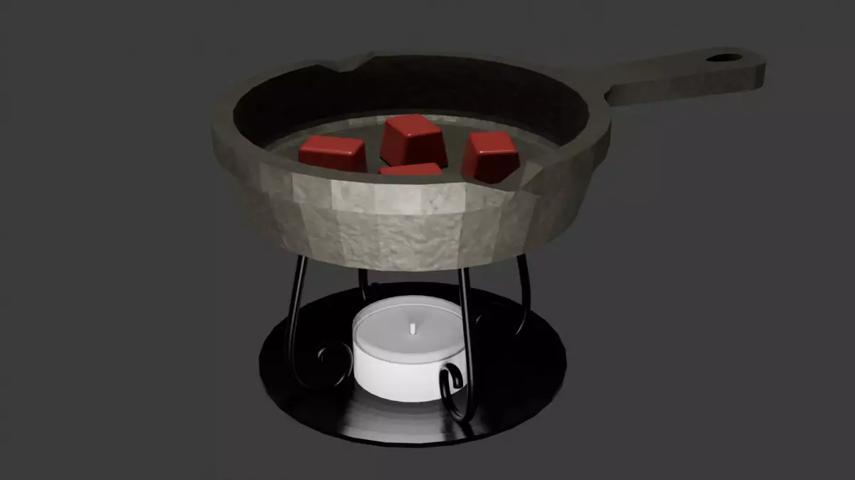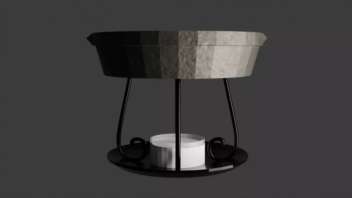This Cast Iron Skillet Tabletop Wax Warmer brings rustic charm and cozy fragrance to any space. The design features a miniature cast iron skillet perched on an ornate metal stand with curled legs, giving it a vintage, farmhouse-inspired look. The stand rests on a matching black painted saucer that protects your tabletop while adding a clean, finished base. A small candle sits beneath the skillet, providing gentle heat to melt the included wax cubes—both of which are modeled separately and neatly parented for easy positioning. The combination of cast iron texture, curled metal details, and simple functionality makes this piece perfect for kitchens, living rooms, or anywhere you want warm light and inviting scent.