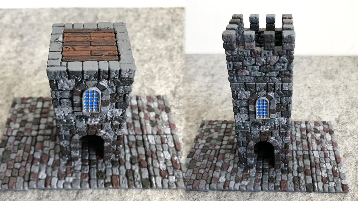 There were many types of towers in the Middle Ages, but one of the main ones was squaretowers. In this section are presented small towers, all modular pieces are made for the development of different options for building a castle. There is a piece with 1 entrance or 4 ntrances, there is 1 window or 4 windows, there is also a mix of windows and doors. There are four towertops, 2 by the diameter of the towers and 2 with a ledge, loopholes also differ on the tops, there are oblique and square. Each piece has ledges for installing the floor, here are 3 types of wooden floors with different diameters.