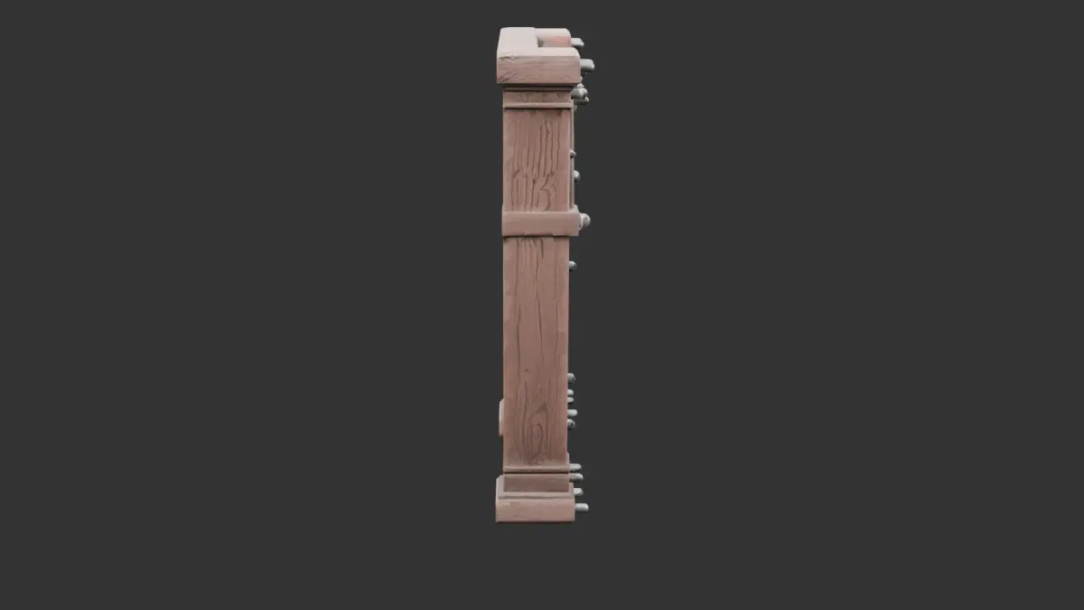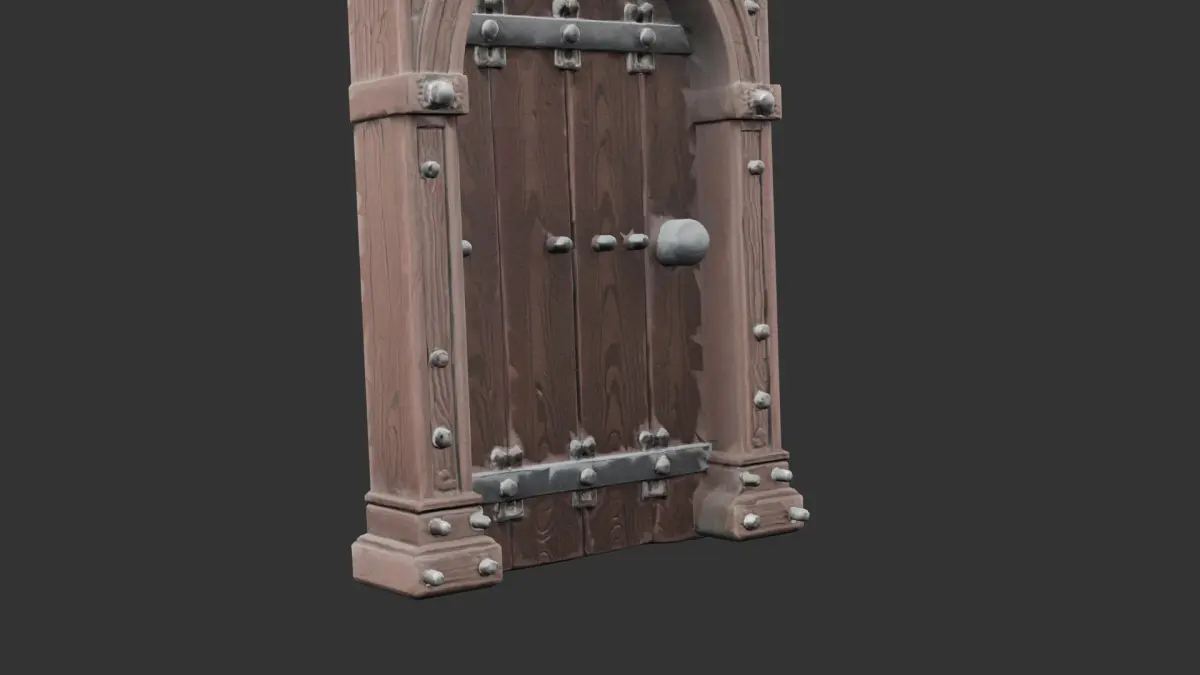 This 3D model features a heavy wooden dungeon door set in a simple stone frame, reinforced with old iron hinges and studs. The design is inspired by medieval castle architecture and is ideal for dungeons, prisons, or fortress interiors. The wood has visible grain, scratches, and cracks, while the metal components display rust and corrosion. This static prop is useful for adding realistic architectural detail to fantasy or historical scenes. It can serve as a functional doorway or as a decorative wall piece in games, simulations, or renders. This door helps build a dark and immersive atmosphere suited for RPG environments or horror-themed settings.