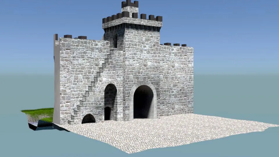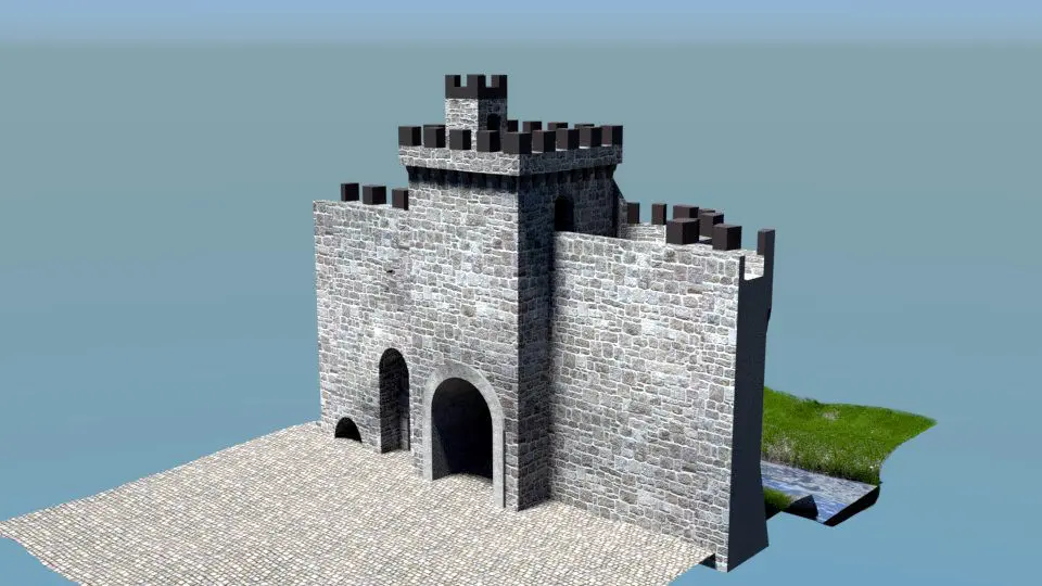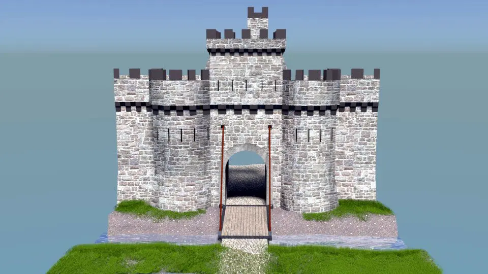 Castle gate of any well known castle or indeed town of the middle ages.Such gates with half drum or square towers would have been a familiarsight in much of Europe