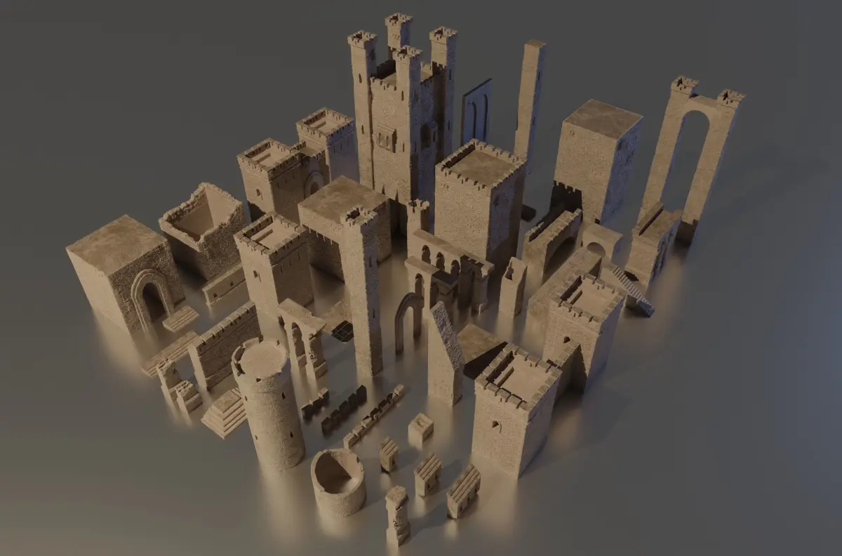 This castle pack was made in 3DCoat and rendered in Blender and textured in Substance 3D Painter.