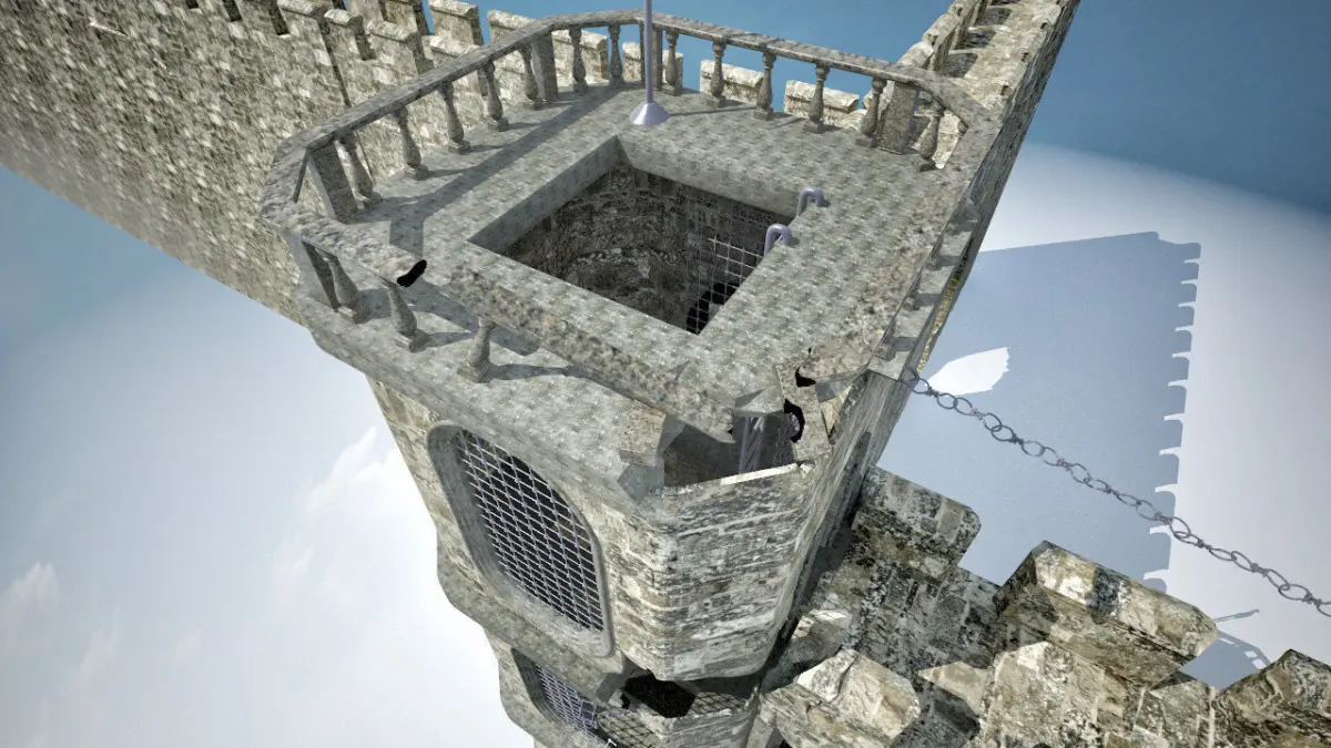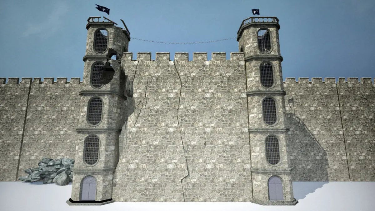 There are 4 walls, 2 towers in the project. 1 solid wall, 1 a little damaged wall, 2 broken walls. 2 towers one prestine one damaged. Without copied walls scene has 2955963 polygons. Most poligons are in the tower windows, 898828 polygon on one tower for the windows metal cages.