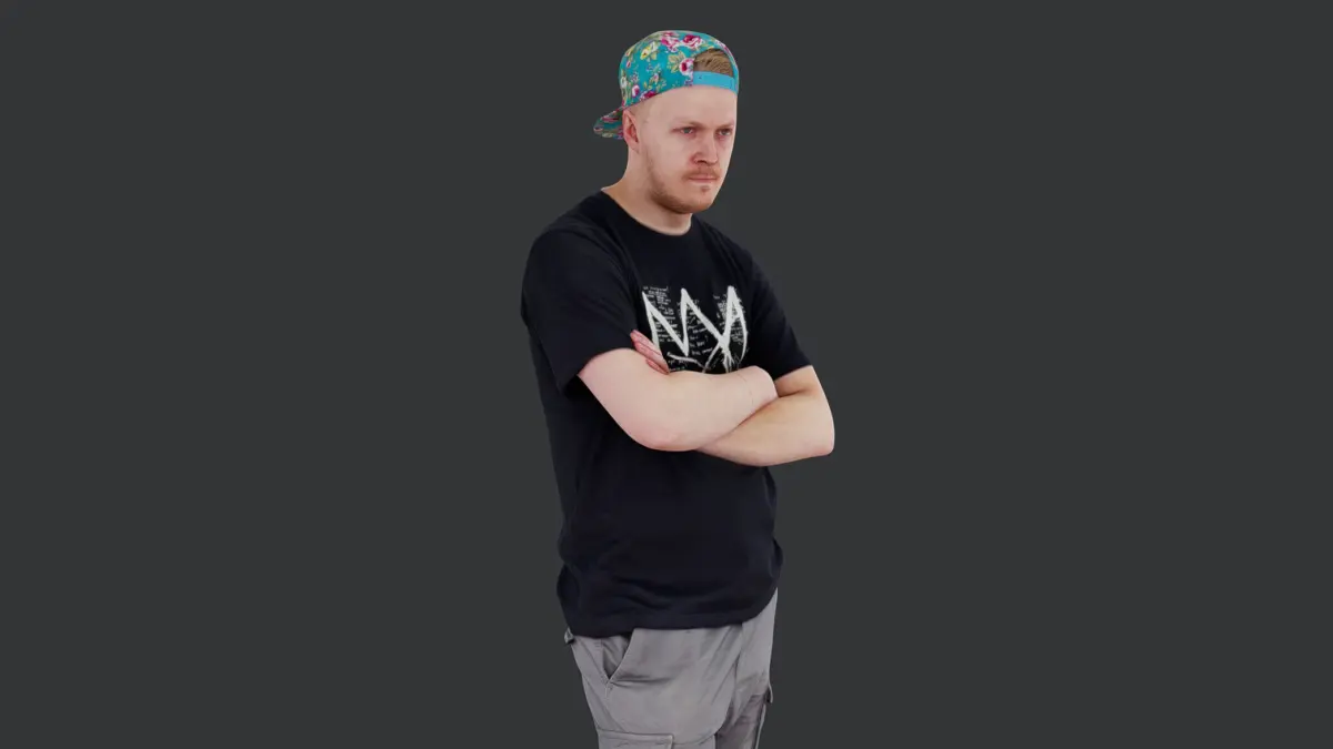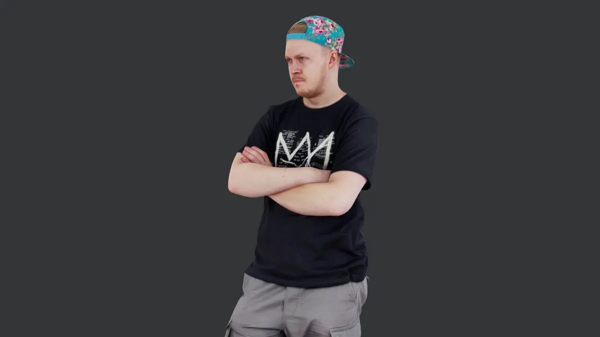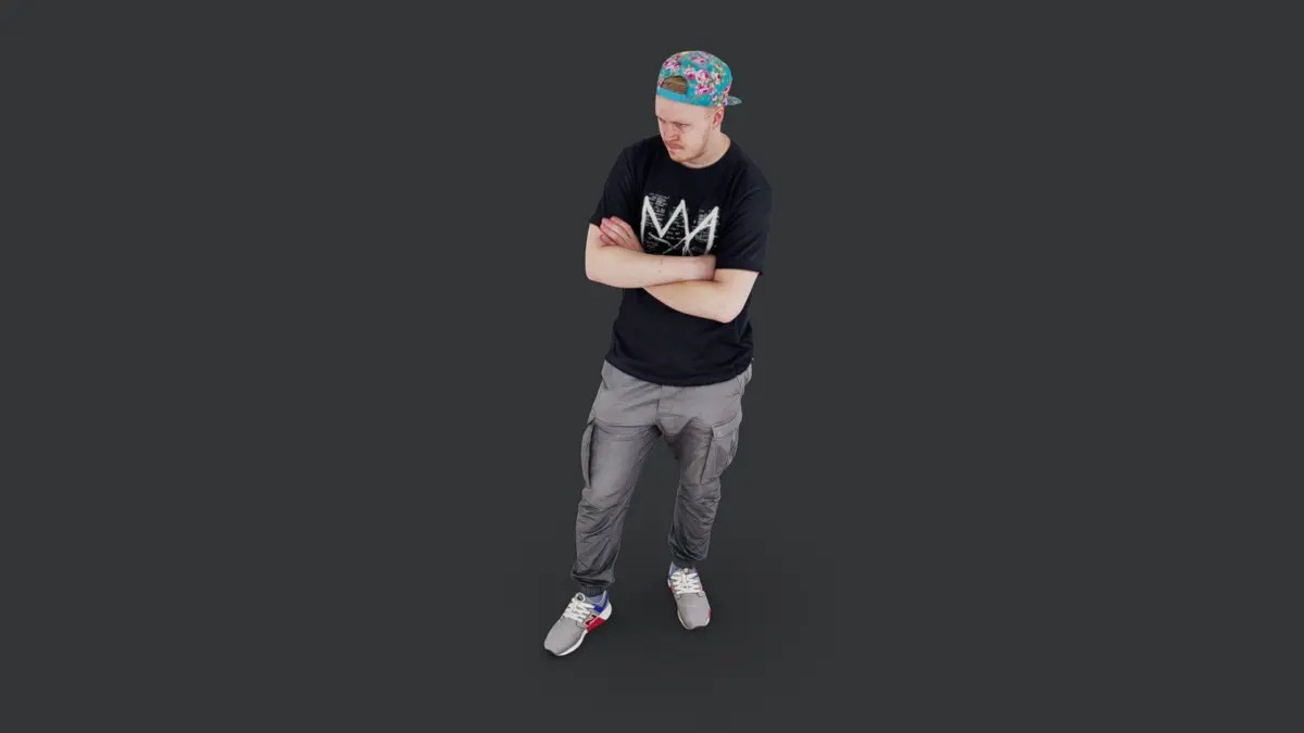 A laid-back young man stands with arms crossed, exuding a confident and relaxed attitude. He wears a black graphic T-shirt, light gray cargo pants, and stylish sneakers, complemented by a vibrant floral cap worn backward. His outfit and stance make him perfect for modern urban scenes, street fashion projects, or casual lifestyle visualizations. The model is detailed and versatile, suitable for multiple perspectives in scene compositions.