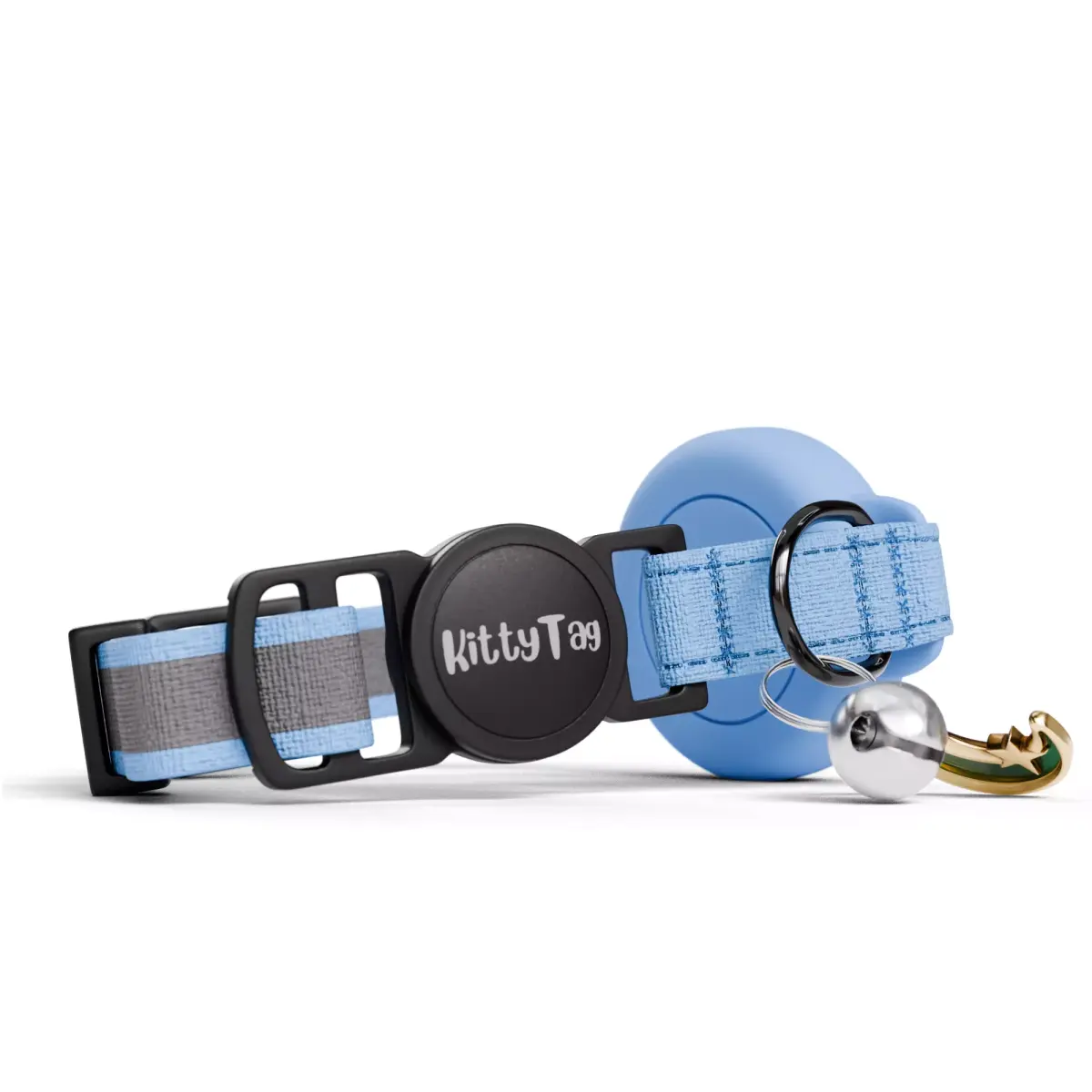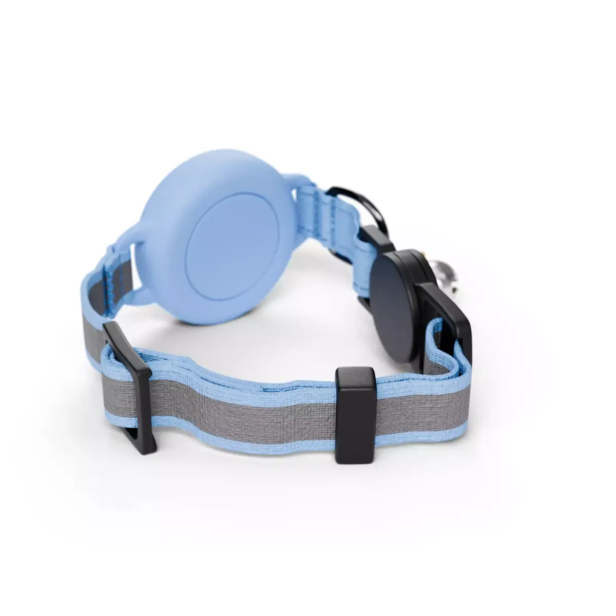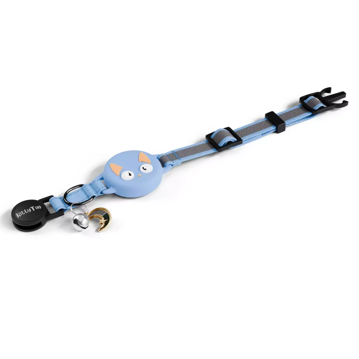 A playful 3D model of a cat collar featuring a light blue strap with reflective accents, a cartoon cat face tag, and a small crescent charm. Includes secure buckle and adjustable strap.