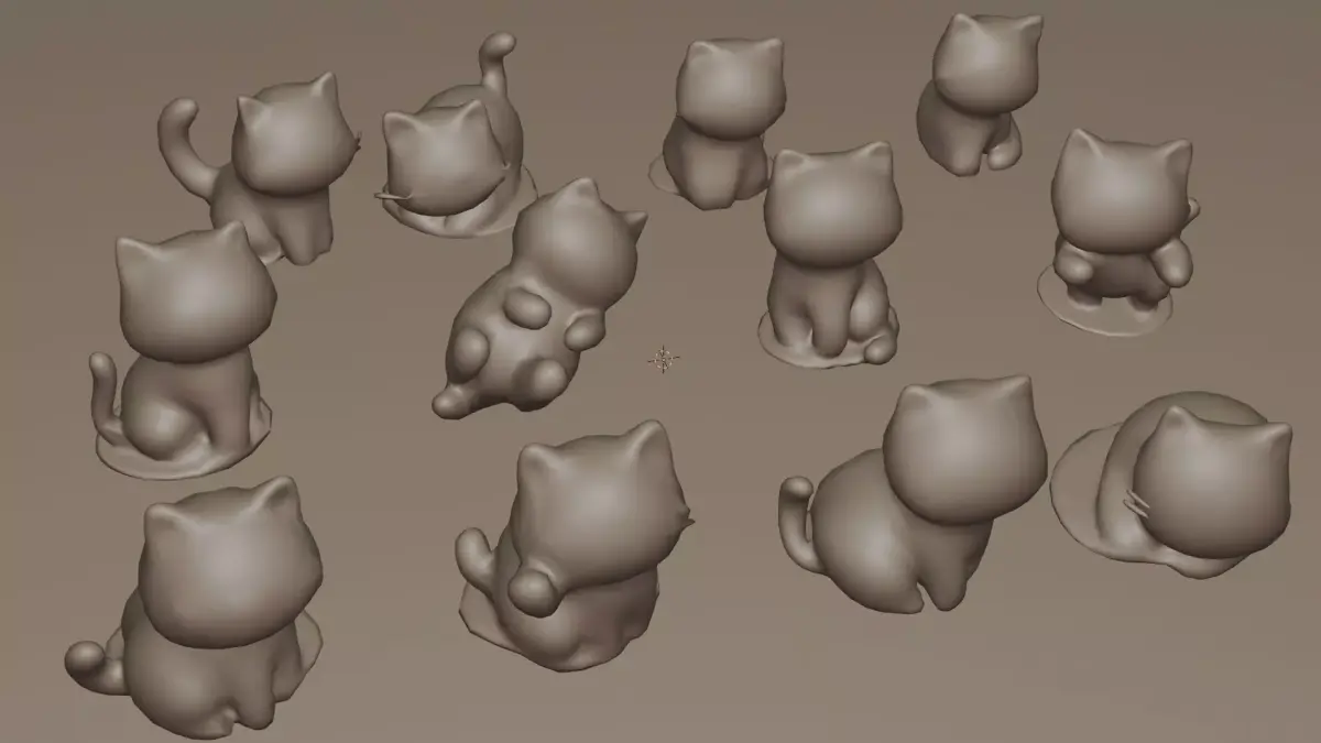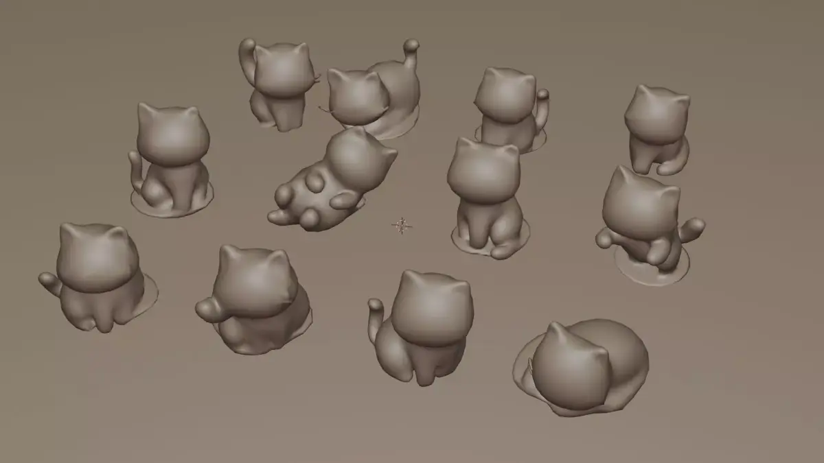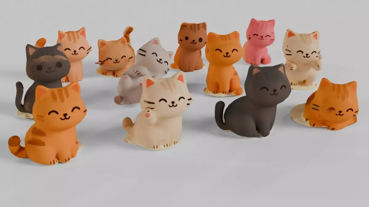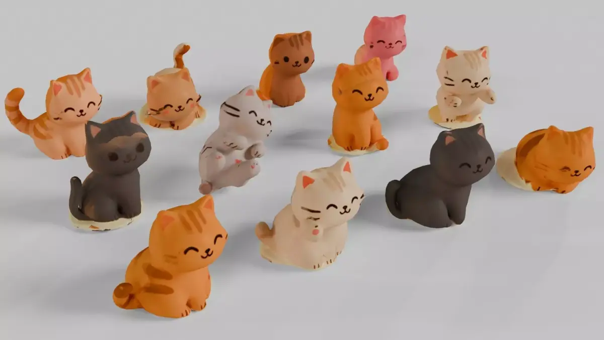 This stylized 3D asset features a delightful set of twelve cartoon-style cat figurines, each with a unique pose, color palette, and cheerful expression. The cats are designed with playful fur patterns—stripes, patches, and solid tones—and are sculpted in various positions such as sitting, lying down, and curled up. Each figurine is placed on a small circular base, making them ideal for use in mobile games, AR/VR environments, or decorative scenes.With some adjustment these model can or posible for 3D Print (STL file include)