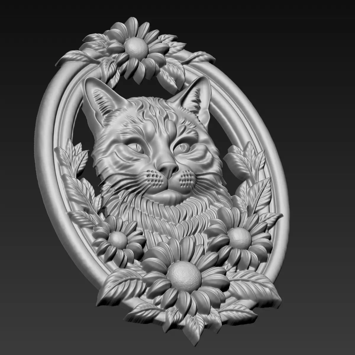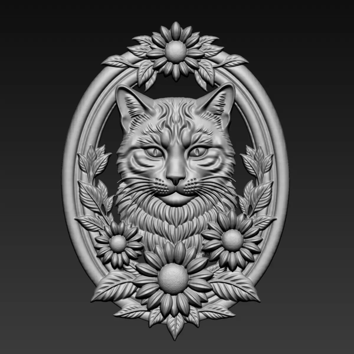 3d model of bas-relief of a cat head with sunflowers border ready for CNC Router Carving or 3d printer.OBJ,STL format.Note:All the models are not for resale,it is illegal!