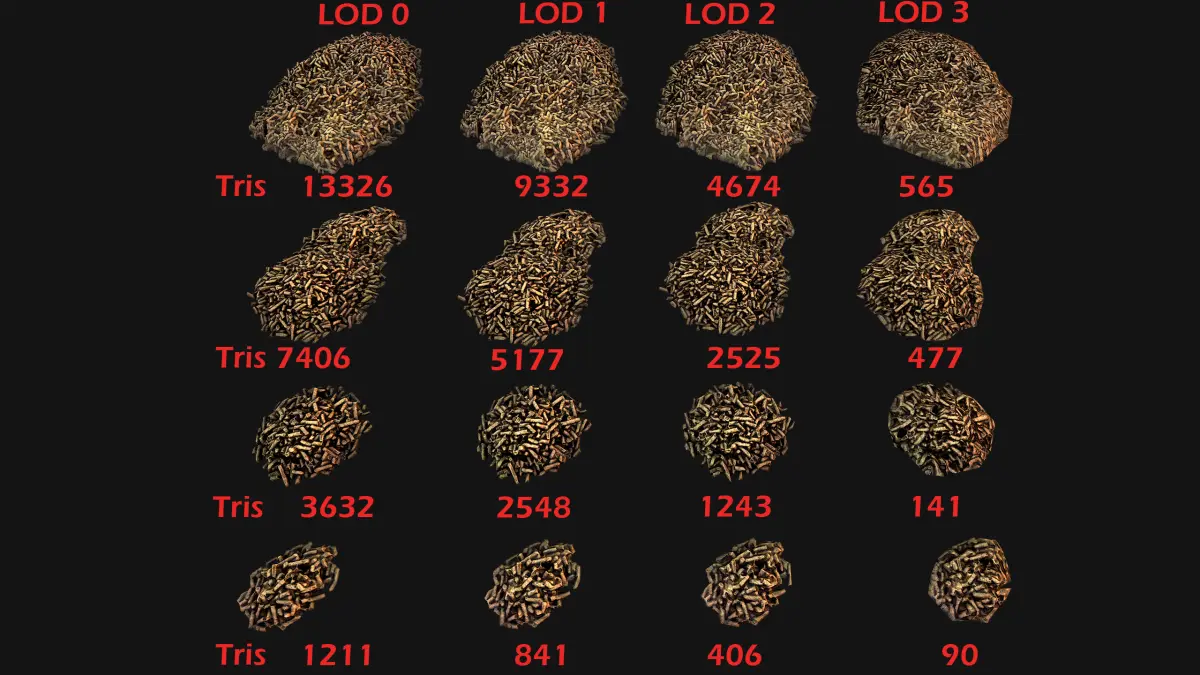 - Verts: 642(LOD0),450(LOD1),222(LOD2),54(LOD3).