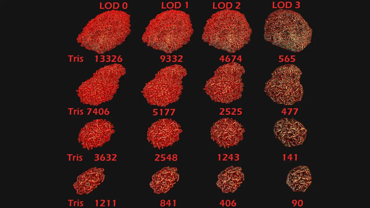 - Edges: 11203(LOD0),7844(LOD1),3838(LOD2),731(LOD3).