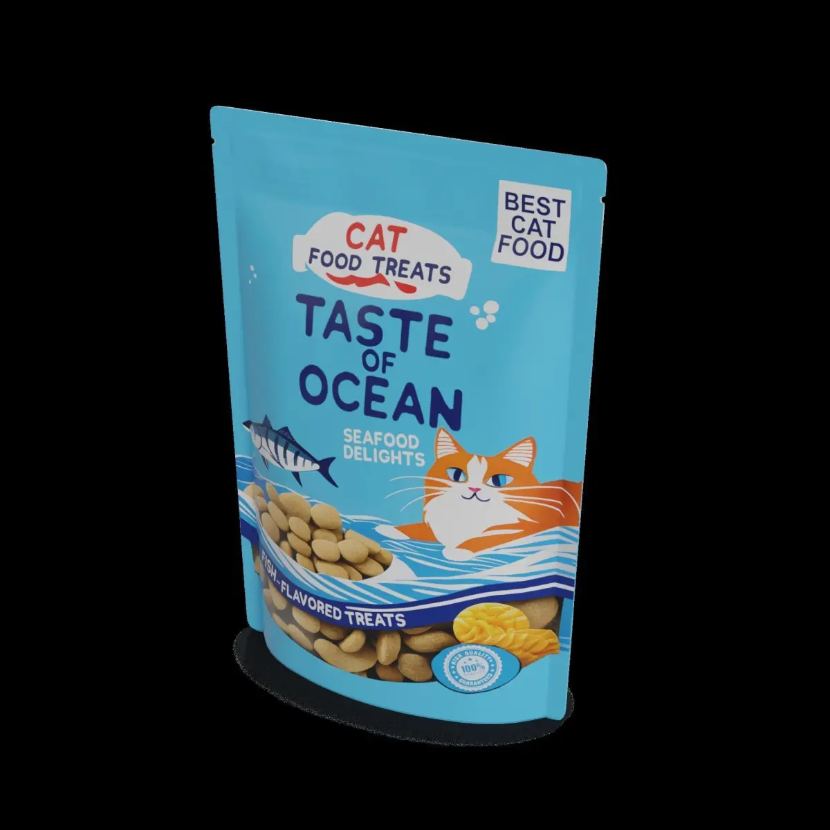 Cat Snacks: Treat your cat to a taste of the ocean with these seafood delights. The packaging is a calming blue color, with a wave pattern and a picture of a cat fishing. Inside, you'll find a mix of fish-flavored treats, including salmon, tuna, and sardine. The packaging includes a fun fish-shaped toy.