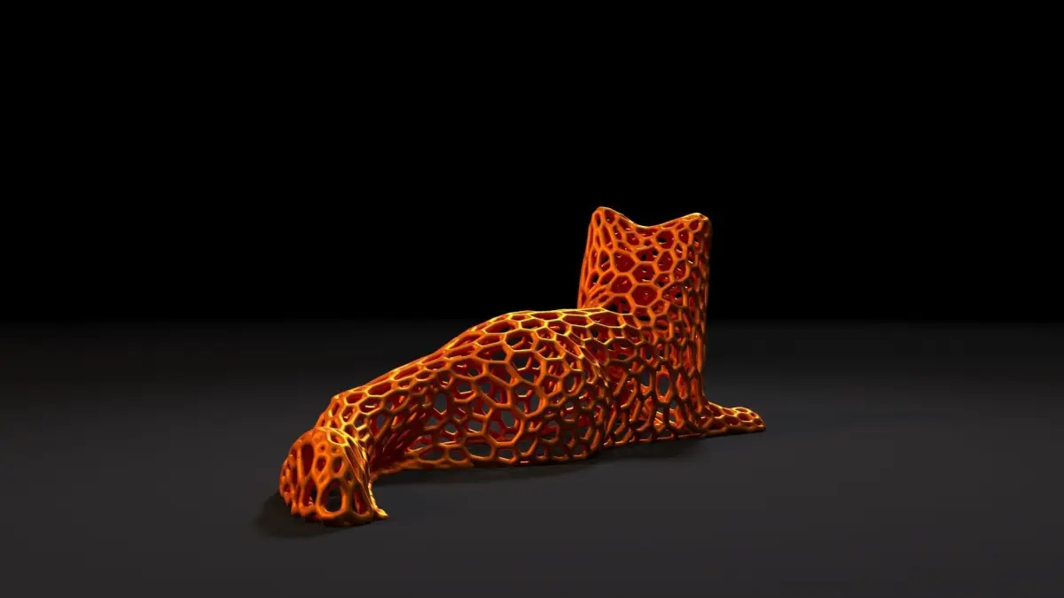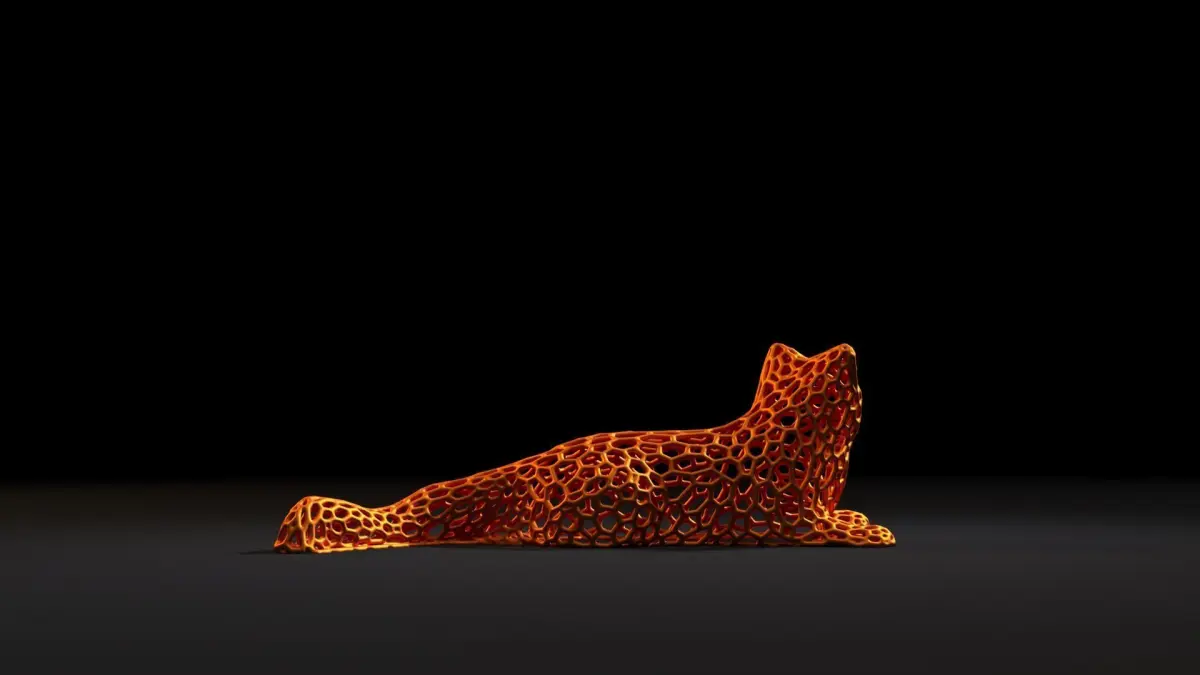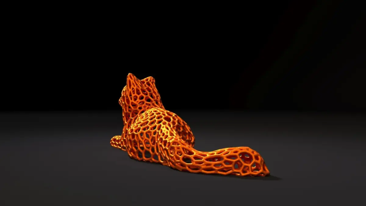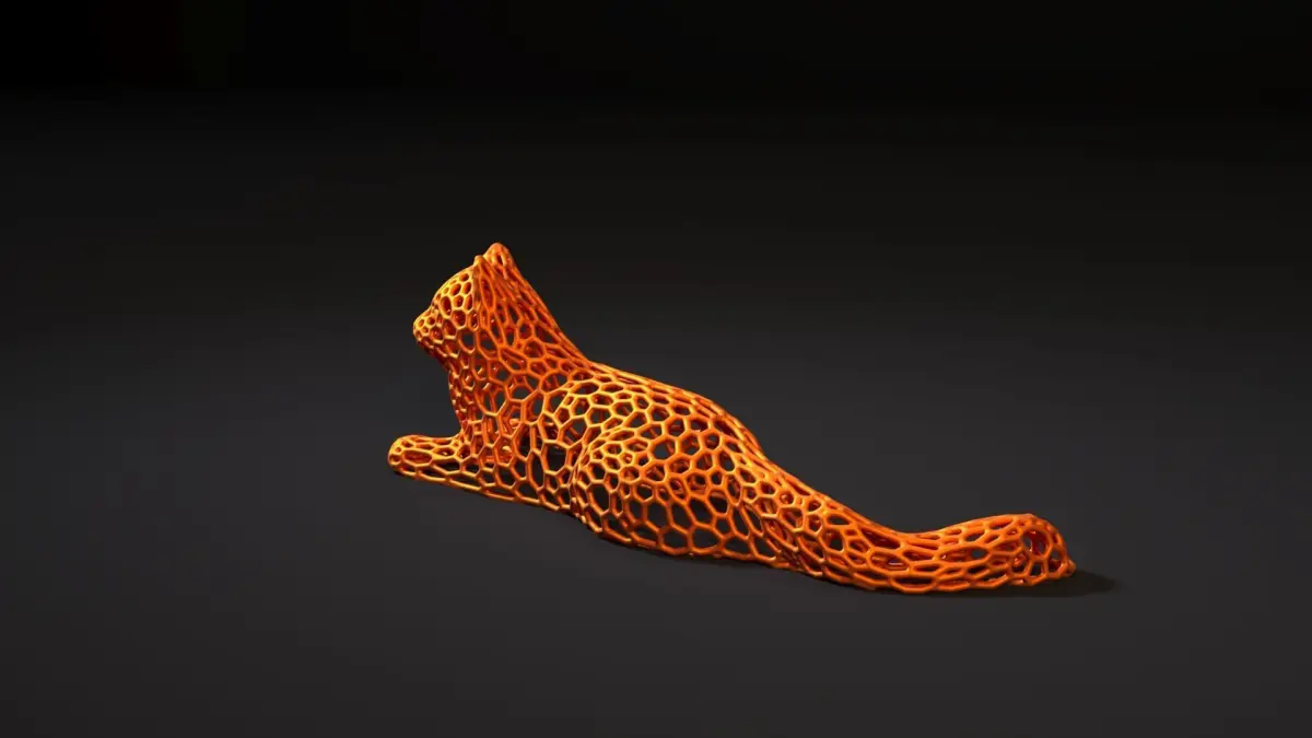 This unique 3D model is made in the modern voronoi style, which is characterized by a mesh structure with geometric fragments that create a fractal and dynamic effect. The model is a stylized cat with expressive details, ideal for printing on a 3D printer.