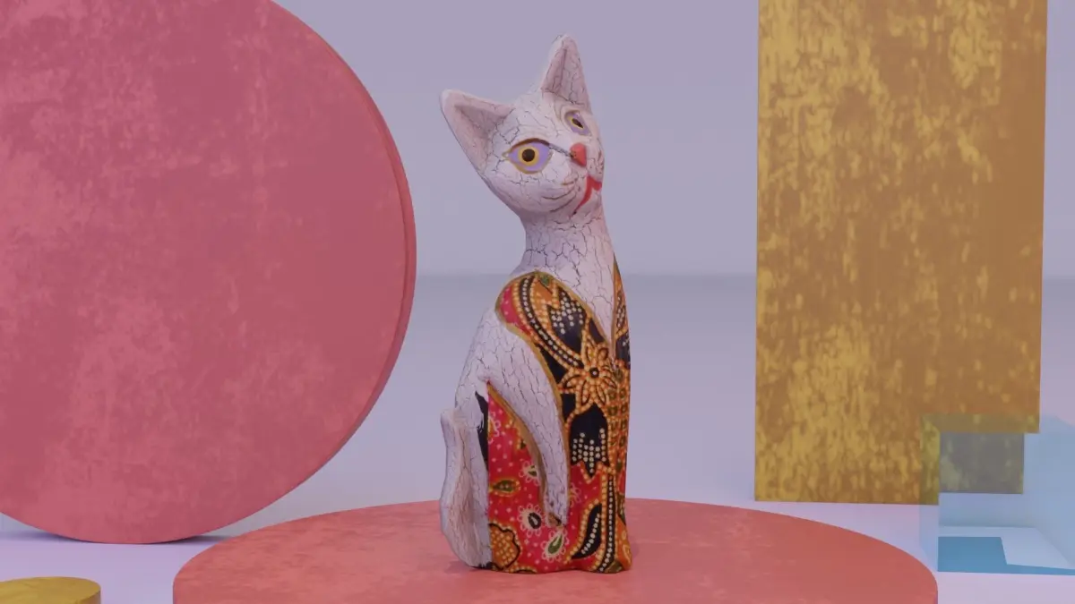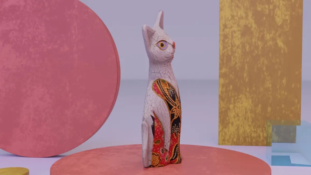 This is a photorealistic low-poly 3D model of the handmade cat wood statuette.