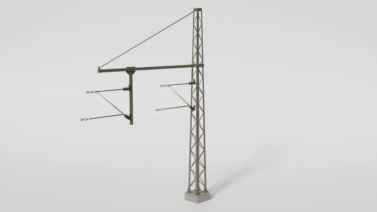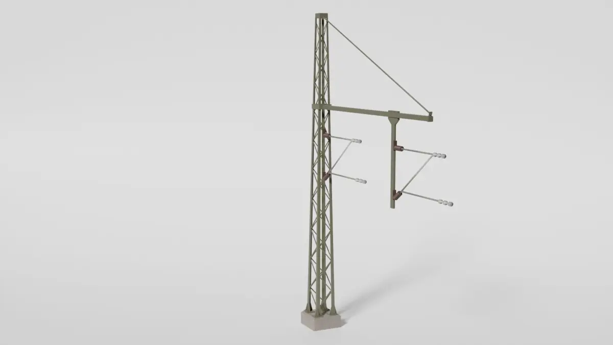 Detailed model of a catenary wire mast with a pipe boom for two tracks. Textures and materials included. Other file format is x3d. This model was built in Blender 3.4.