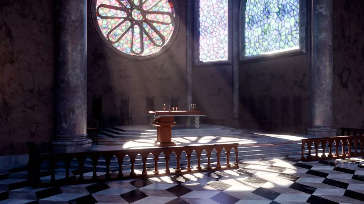Fully modeled cathedral interiorRealistic architectural proportions and detailingHigh-quality materials and shadersMix of 4K and 2K texturesDetailed marble floor, stone pillars, wood elements, and stained glassCinematic lighting setup includedReady for rendering