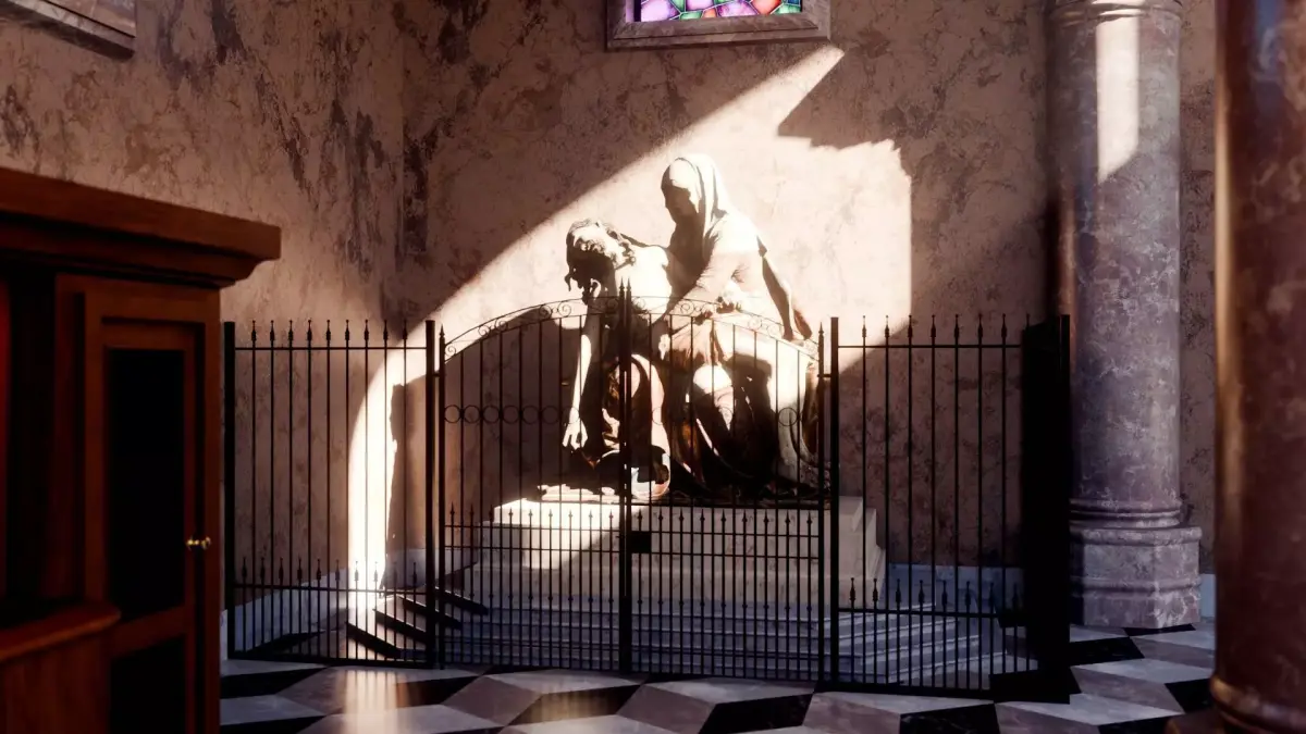 This environment recreates a classic European-style cathedral interior featuring grand stone columns, arched vaults, detailed chandeliers, wooden pews, confessionals, marble floor tiling, and stained-glass windows with dynamic light interaction. The scene is carefully composed to achieve a dramatic and atmospheric lighting setup, ideal for high-end renders.