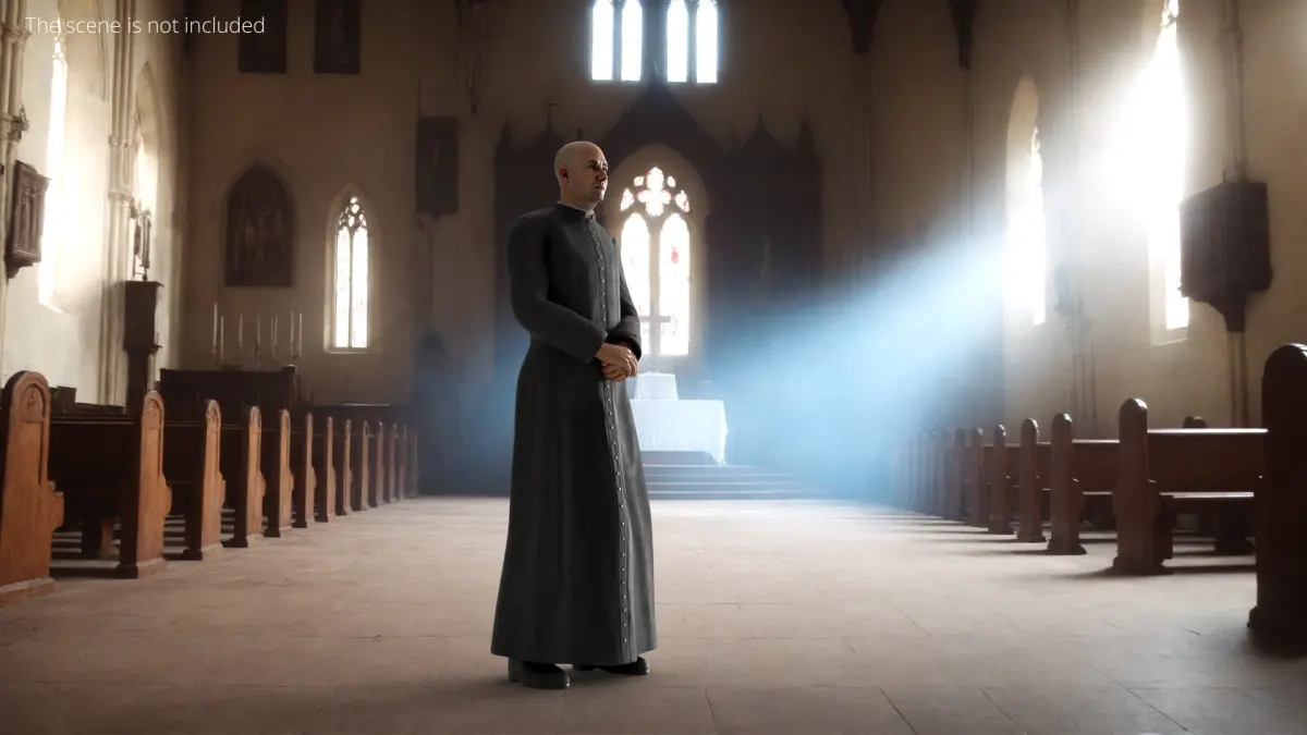 The rigged priest model is built with a fully adjustable skeleton, allowing for fluid animation of various poses and actions, making it ideal for use in animations, games, and simulations. The clothing and accessories are carefully designed to maintain both realism and flexibility, ensuring the model fits well within religious or historical contexts. This detailed 3d model is perfect for projects requiring a lifelike depiction of a Catholic priest figure.