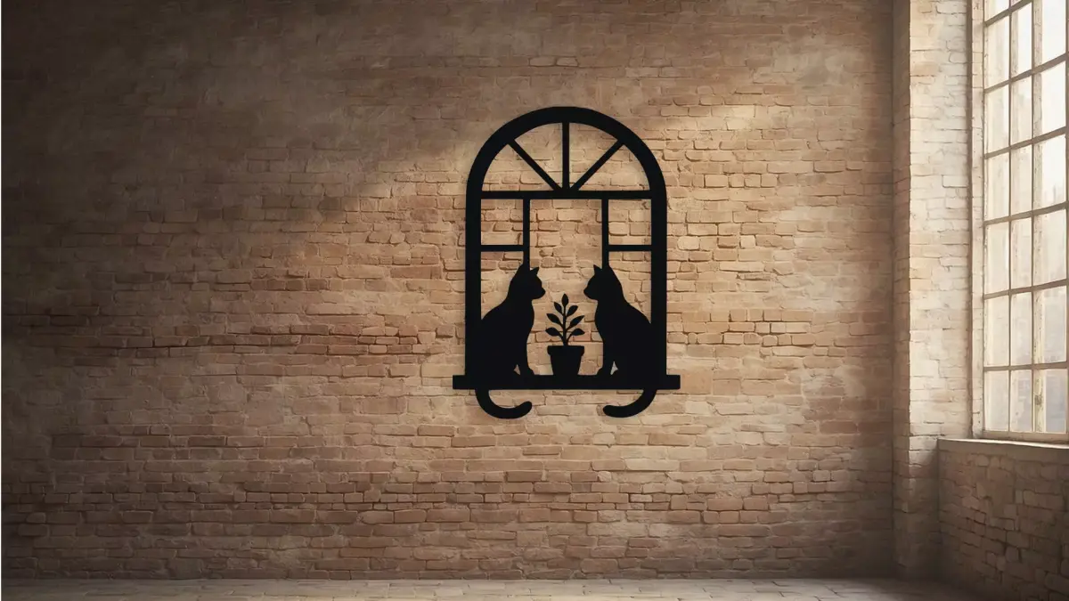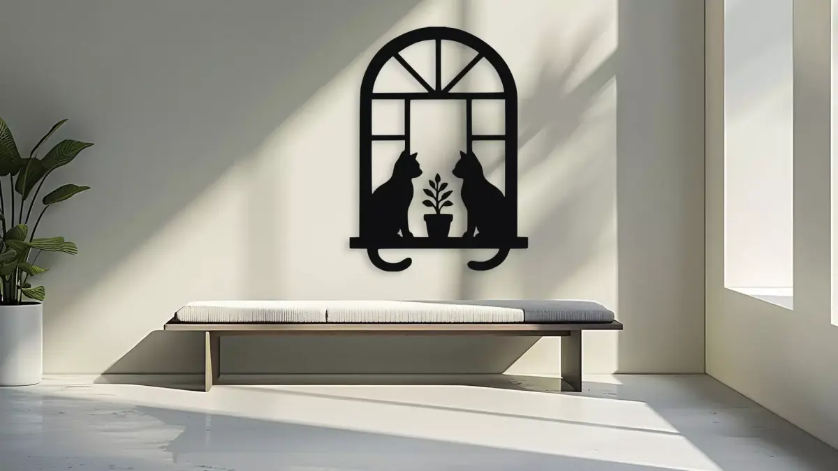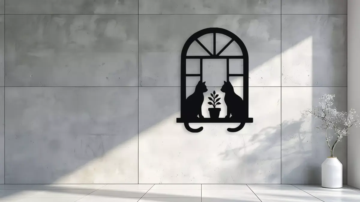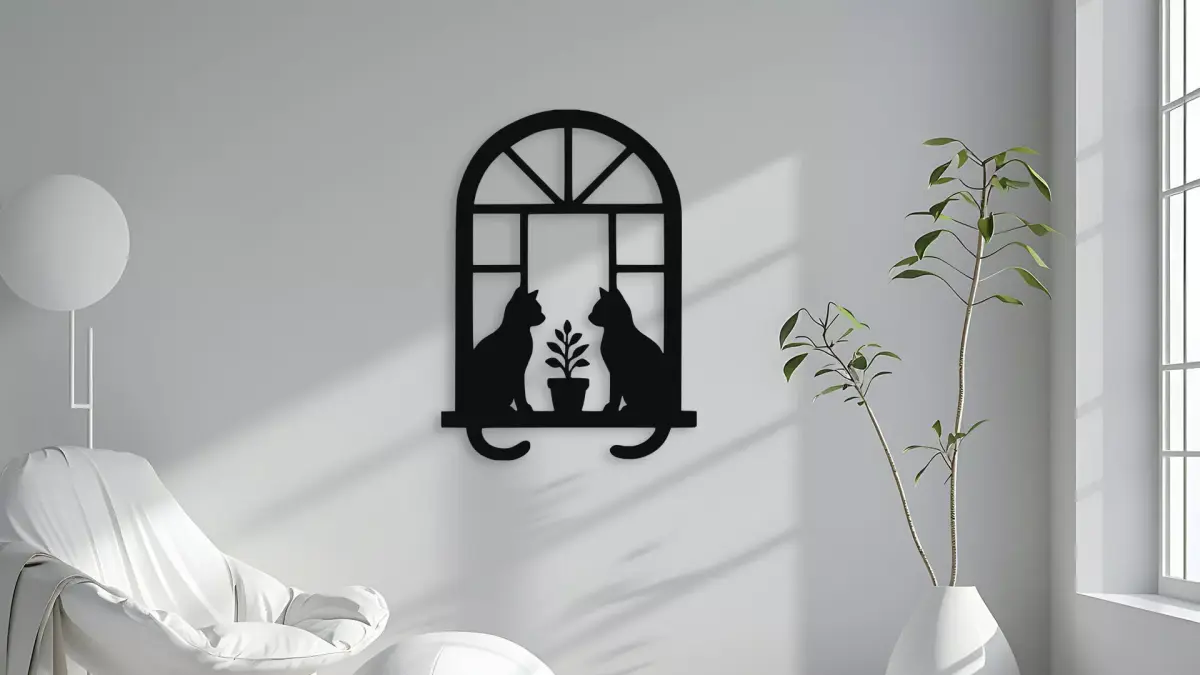 Elegant silhouette wall decor featuring two cats sitting on a window sill with a plant. This charming piece adds a touch of sophistication and feline grace to any room. Perfect for cat lovers and those seeking unique home accents. This file is perfect for 3d printing, laser engraving and cutting, wood carving, vinyl cutting, t-shirts, clothing, stickers, cardbox... You will receive these design in 10 file formats: STL, STEP, OBJ, AMF, SVG, DXF, AI, PDF, PNG, EPS